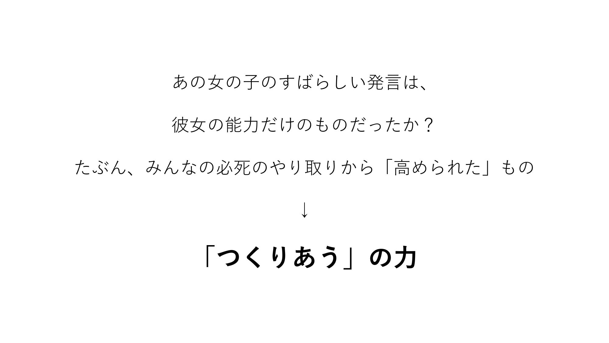 あれは、みんなのエネルギーの高まり、必死のやり取りの中から、能力が高められたからこそ出てきたものではないかと思い、これこそが「つくりあう」ことの力なのではないかと思ったのです。