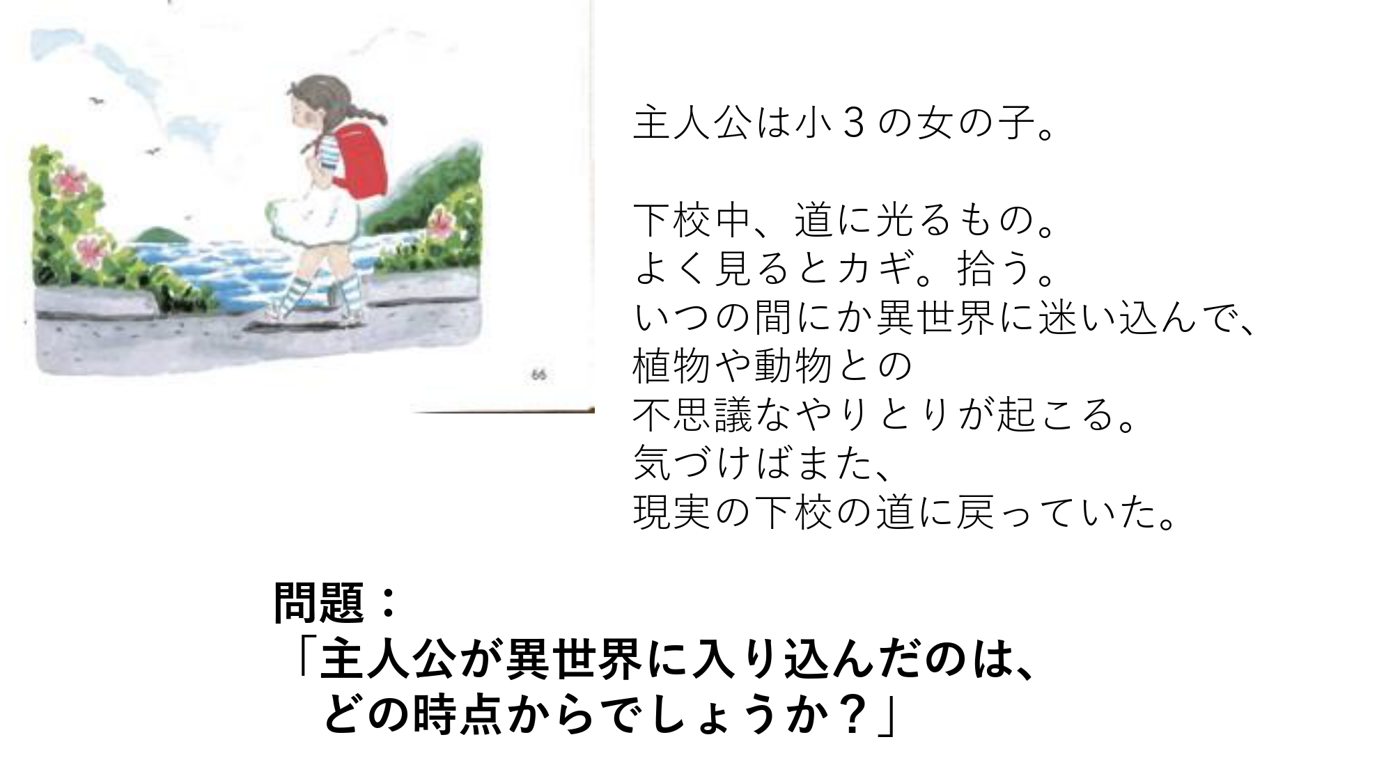 この物語について先生が生徒に、「主人公が異世界に入り込んだのは、どの時点からでしょうか?」という質問を投げかけます。