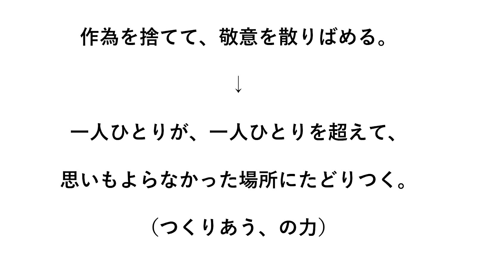 作為を捨てて敬意を散りばめるというのはなかなか難しいことだと思いますが、そうすることの先にあるのは、一人ひとりが、彼ら自身を超えて、思いもよらなかった場所に辿りつくことができる状態です。