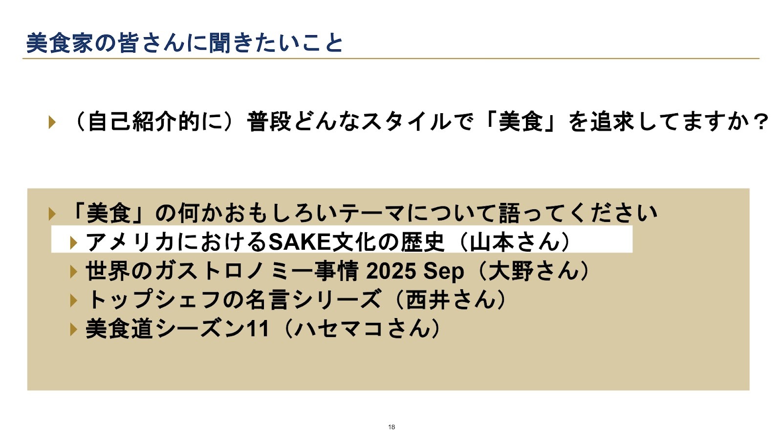 山本さんからアメリカのSAKE事情、大野さんから世界のガストロノミー事情、トップシェフの名言シリーズをちょっとはさんで、最後にハセマコさんから美食道シーズン11です。