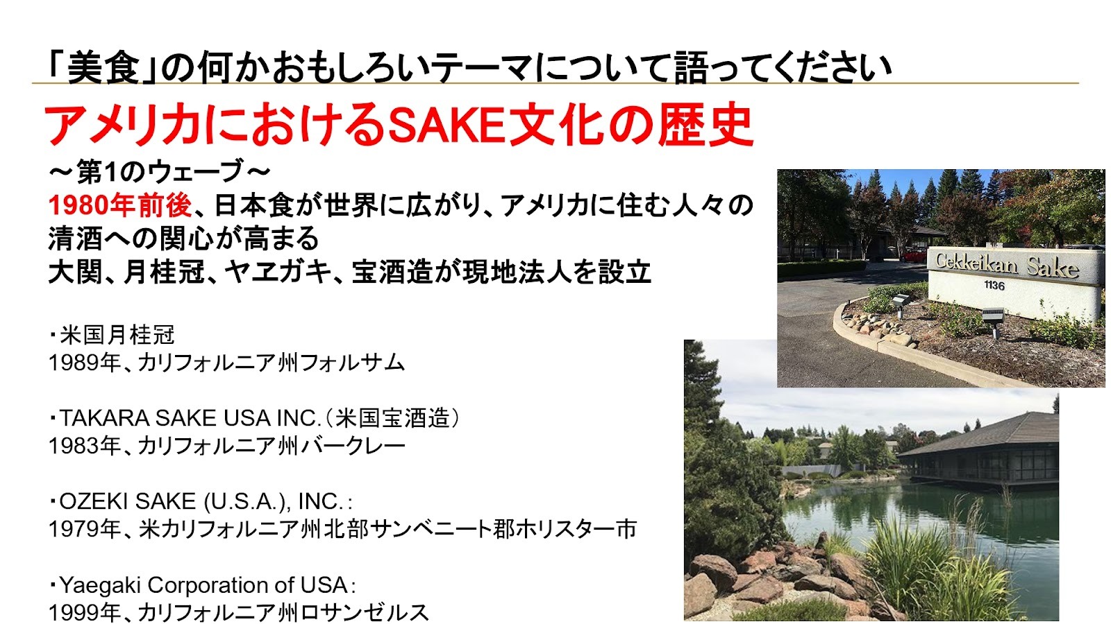 フードカルチャーとしての酒が世界にどう広まっているか、また、我々はLAに進出するので、アメリカの酒蔵事情はどうなっているのかについてお話しします。