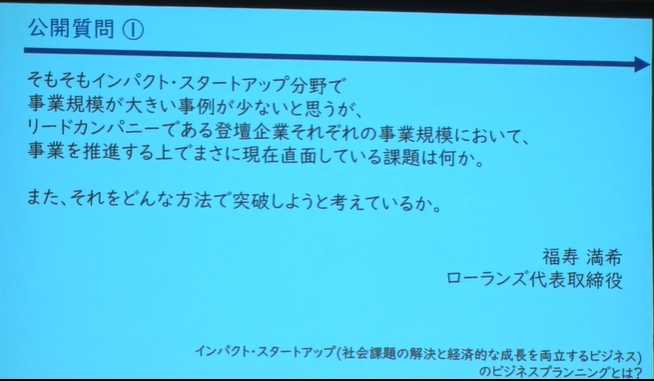 「そもそもインパクト・スタートアップ分野で事業規模が大きい事例が少ないと思うが、リードカンパニーである登壇企業それぞれの事業規模において、事業を推進する上でまさに現在直面している課題は何か」という質問です。