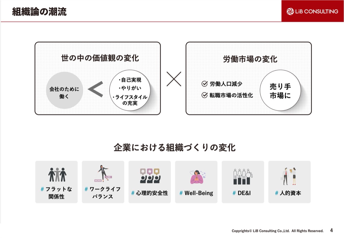 昔は「会社のために働く」ものでしたが、自己実現ややりがい、ライフスタイルの充実などが重視されるようになり、労働市場もどんどん売り手市場になっていった中で、組織作りにおいて、いろいろなキーワードが生まれました。
