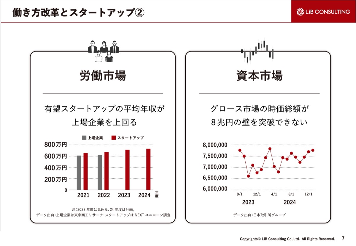 労働市場では、スタートアップの平均年収が上場企業を上回るという非常に良いニュースがありながら、資本市場では、グロース市場の時価総額が8兆円の壁を突破できません。