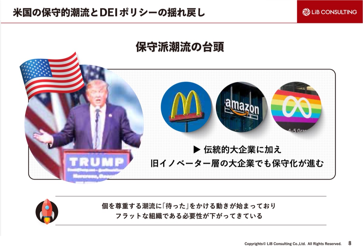 今週もいろいろなニュースがありましたが(登壇は2025年2月当時)、DE&Iポリシーの揺り戻しなどが起こり、個の尊重や実力主義というスタートアップの潮流に、「待った」をかける動きになっています。