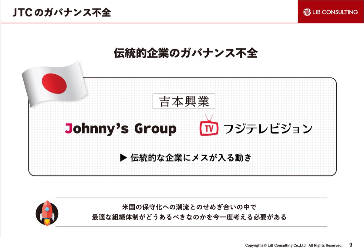 一方、日本はどうかと言うと、吉本興業や旧ジャニーズグループ、フジテレビなどの伝統的企業がガバナンス不全に陥ったことで、伝統的企業にメスが入る動きがあり、フジテレビでは長時間の記者会見が起こるような事態となりました。