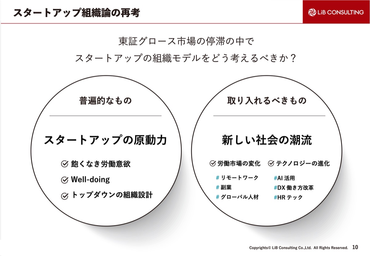 東証グロース市場が停滞する中で結果を出さなくてはいけないので、組織のための組織論ではなく、スタートアップの本来の原動力である、飽くなき労働意欲や勢いのあるカルチャー、新しい社会の潮流として、労働市場の変化やリモートワーク、AIなどのテクノロジーの取り入れも含めて、皆さんとぜひ議論できればと思います。