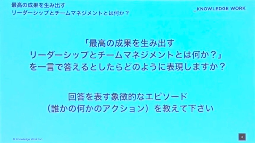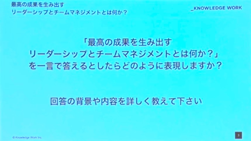 まず、「最高の成果を生み出すリーダーシップとチームマネジメント」について、一言で答えるとしたら何と表現するか、という質問です。