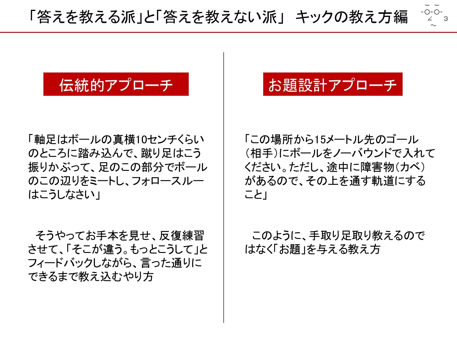 サッカーでボールの蹴り方を教えるとき、伝統的アプローチだと、ボールの横10cmに踏み込んで、足のどこで、ボールのどこを叩いて、フォロースルーはこうで…、という教え方をします。
