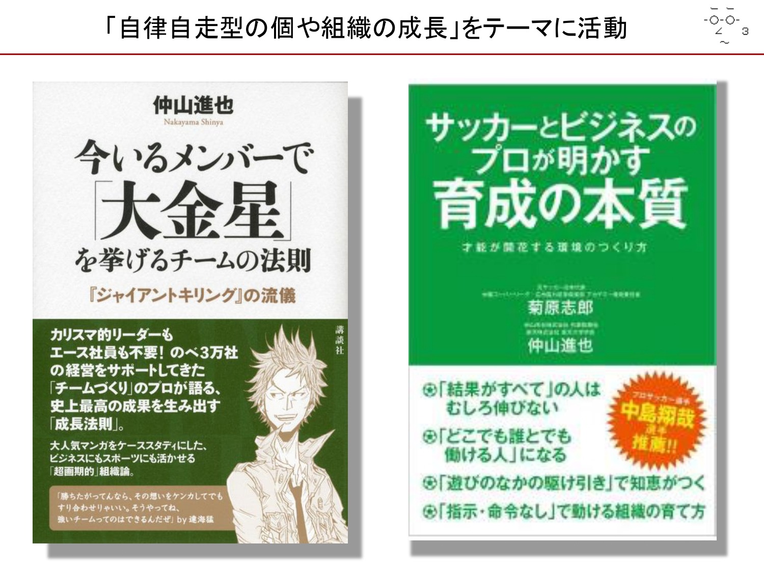 Jリーグのユースチームが舞台の漫画です。これとコラボし、「自分で考えて動くとは、具体的に何をどうすることなのか」を考えたのがスライドの左の本で、そういう自律的な人やチームがどうすれば増えるのかという育成がテーマなのがスライドの右の本です。