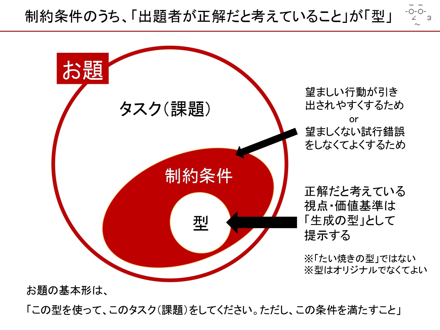 制約条件は、お題に取り組んでいる人にとって望ましい行動がしやすいように、無駄な試行錯誤をしなくてよいようにつけるものです。
