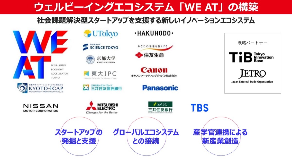ビデオにもありましたが、ウェルビーイングのビジネスや、ウェルビーイング経営を含めて、日本はウェルビーイングの先進国になれると思っていますので、世界に広げるために、色々な企業、大学と一緒にウェルビーイングエコシステム「WE AT」を作っています。