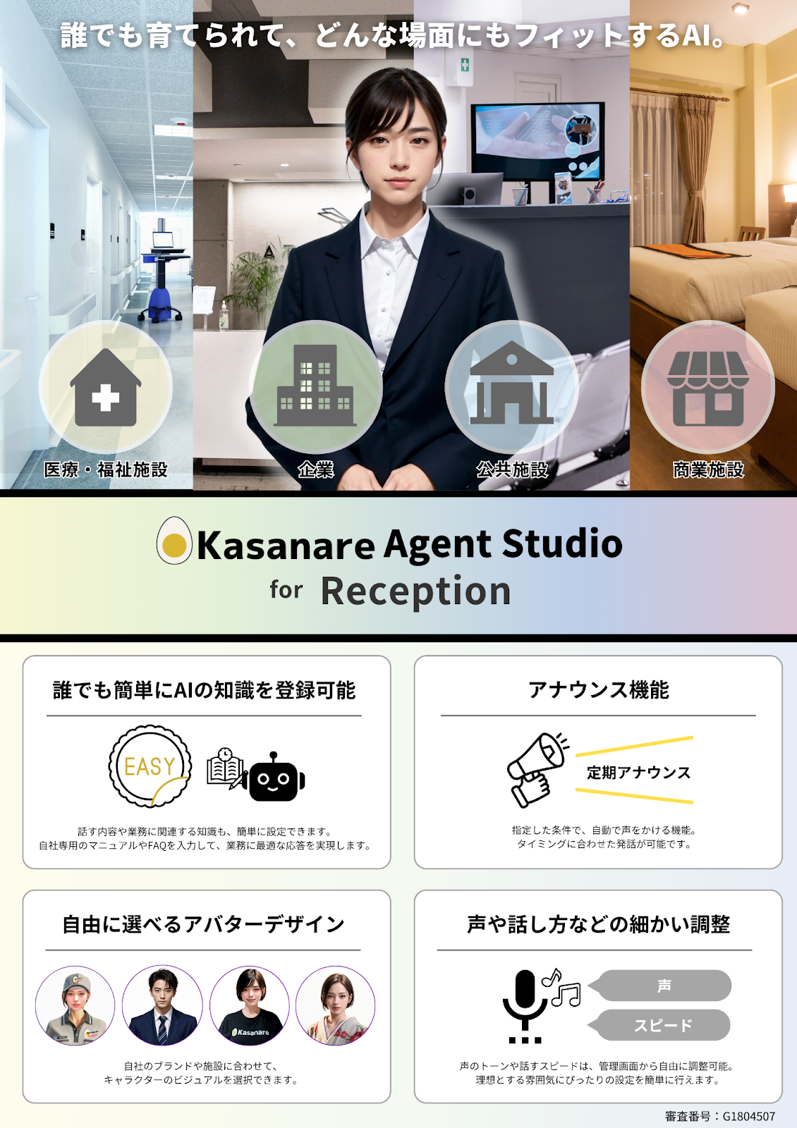 誰でも簡単にAIの知識を登録可能。様々なシチュエーションに合わせ、「現場でDX」が可能な生成AI×アバター。受付、接客、アナウンス等、あらゆる場面にフィットするAIです。