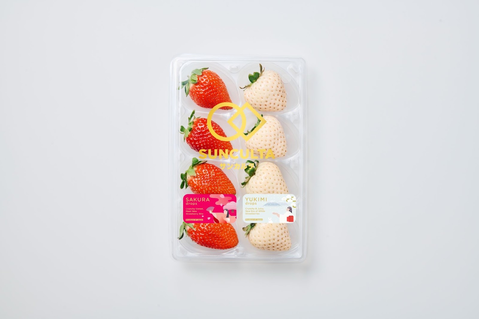 自社開発のイチゴ品種SAKURA DROPS。輸送中の傷み防止に、7〜8割程度の着色で早摘みする業界の常識に挑むべく、日本一の果実硬度を高糖度と両立する品種として開発。実の硬さのおかげで、完熟で収穫・出荷できる「完熟持続品種」として、輸出先の東南アジアで大人気となっています。