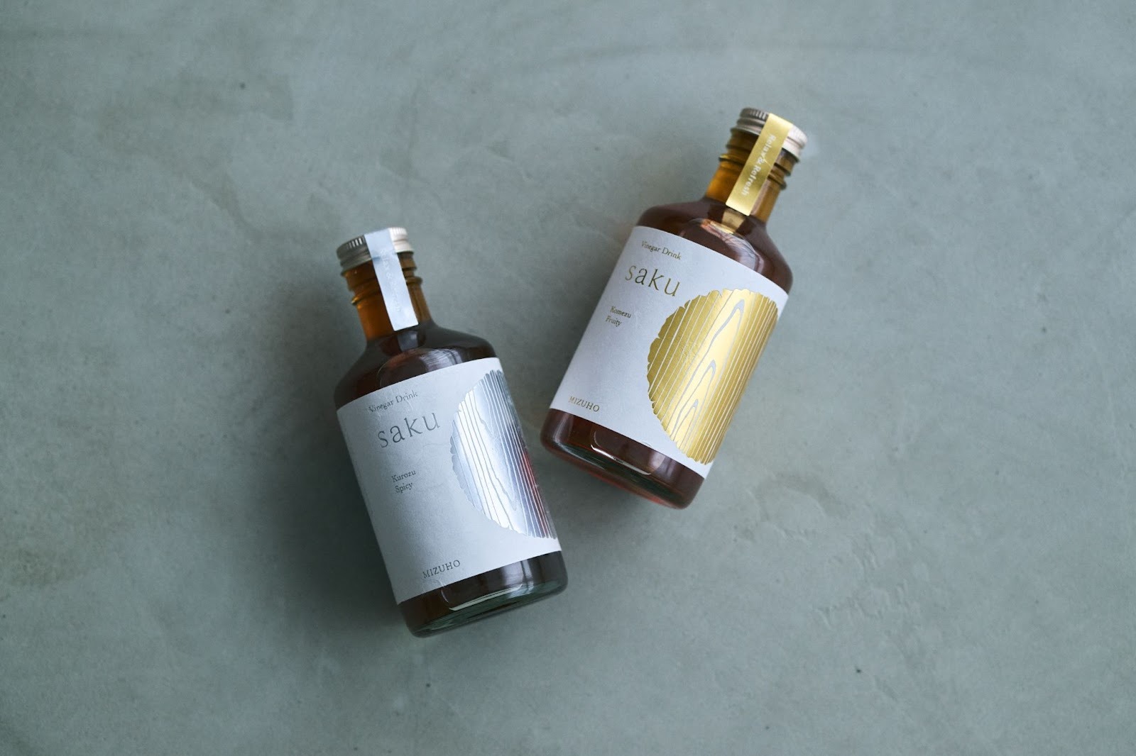 sakuは、吉野杉木桶仕込みの純米酢にスパイスやフルーツで香り付けした希釈タイプのクラフトビネガードリンク。「すこやかに、心地酔い。」をコンセプトに、お酒のように心地よくなる一杯を目指しました。まろやかな酸と深い味わい、体がポカポカする余韻はまるでお酒のよう。この新感覚ドリンクを一度ご体験ください。