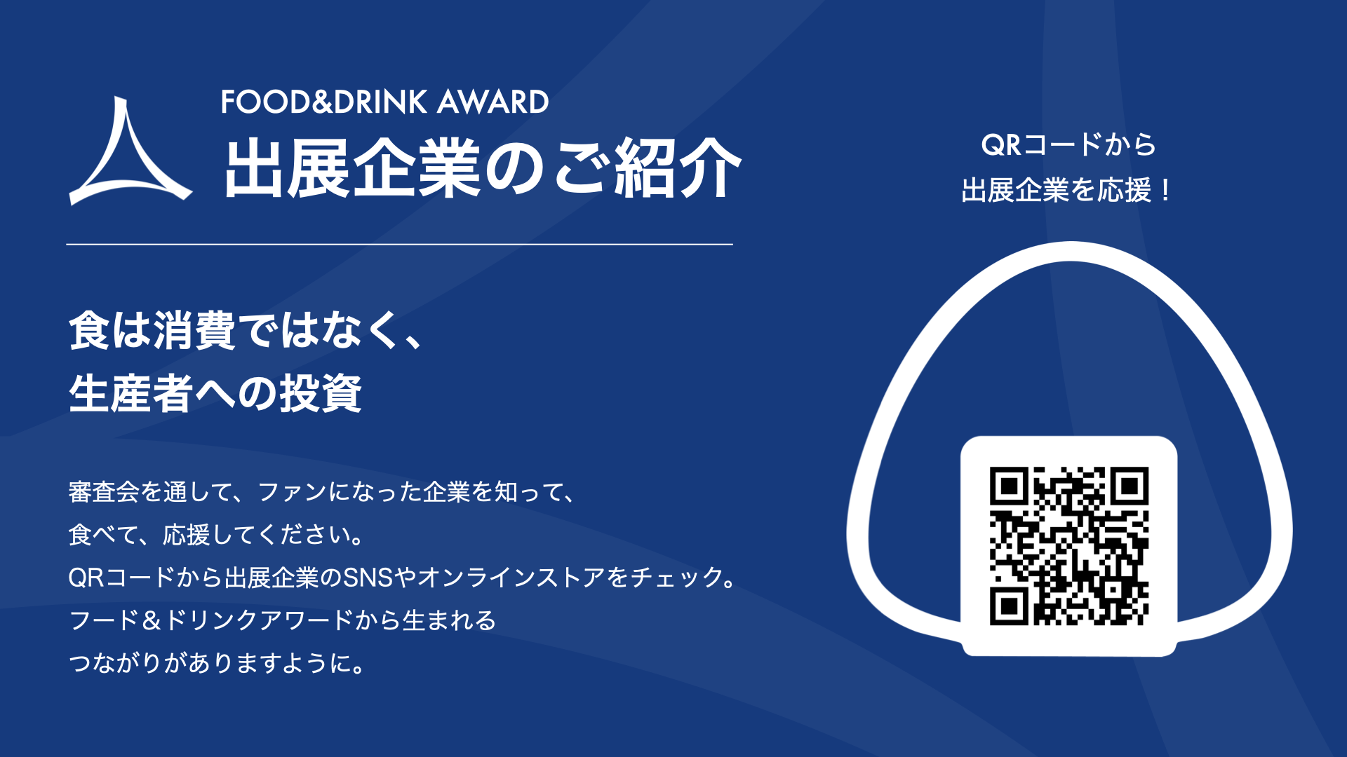 今回の「フード & ドリンク アワード」は、全国から集まった14社が会場に構えるブースを審査員が見学し、各ブースで試食体験を行い、「美味しさ」「サステナビリティ」「アルチザン」「ブランディング」「想いへの共感」などの観点から投票を行いました。また両日のオーディエンス賞の上位3社も選出しました。