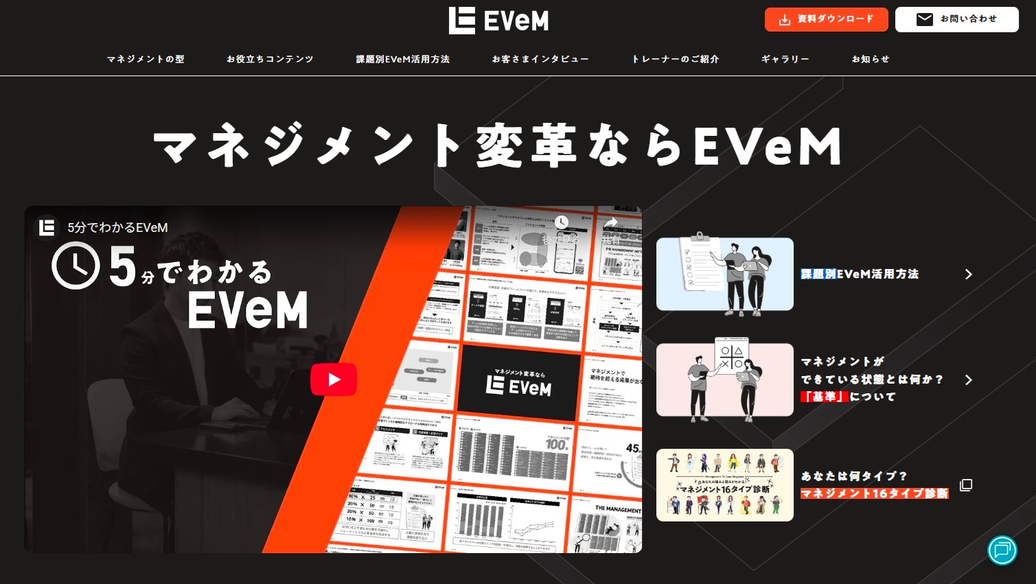 EVeMは、事業成長に不可欠な「組織」を支援する企業です。日々生じる組織課題に対し、独自のマネジメントの「型」を用いて解決へと導きます。課題の洗い出しから適切な打ち手の提案まで、多様な形で組織をバックアップ。事業成長を加速させるためのマネジメント支援なら、ぜひお気軽にご相談ください。