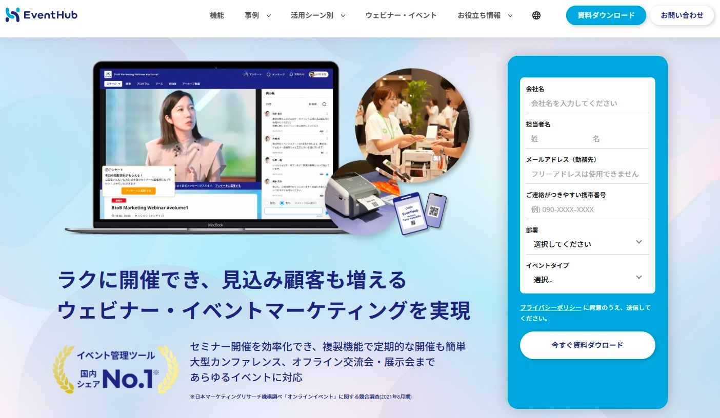 オンライン・リアル・ハイブリッドのイベントから展示会出展まで全てのイベントタイプに対応。参加者の行動ログをリアルタイムで解析したり、ノーコードでMA/SFAと連携できるため、イベントを「開催して終わり」にせず、確度の高いリード獲得へ直接つなげられるイベントマーケティングツールです。