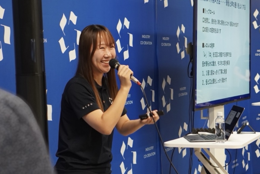 今回初の試みとしては、「声」の勉強を続けている運営スタッフの田中 美咲さんによるボイストレーニング。口周りをほぐして、発声がしやすくなるエクササイズを紹介し、ICCオフィスはかつてないほどの大声で賑やかになった。