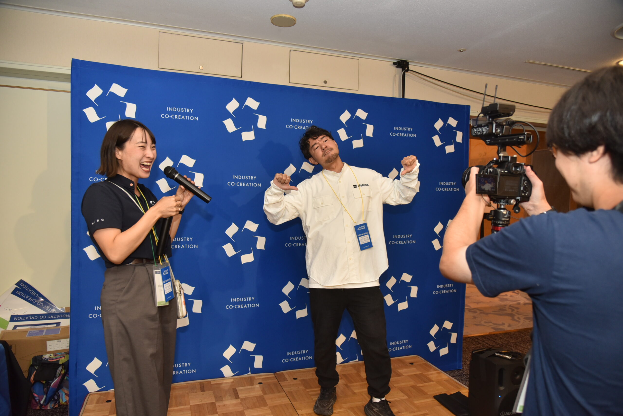 撮影スタジオ統括の山羽 真梨那さんに迎えられたふたりは、スタジオカメラマンの江本 秀幸さんのリードのもと、登壇前の撮影を体験。まずはパネルを持ってICCポーズ。