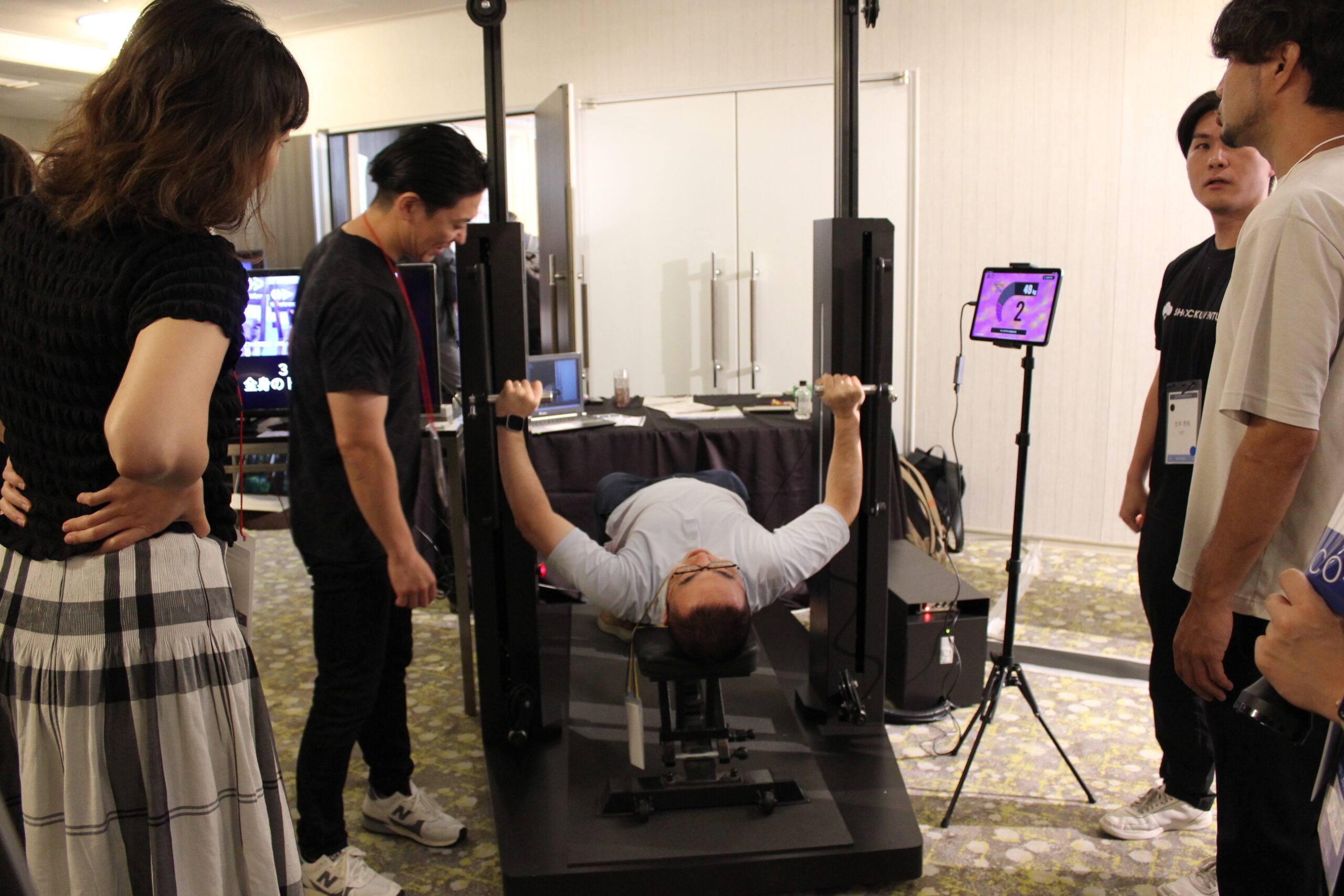 4階東館まで移動したツアー一行は、デザイン & イノベーション アワードの統括、坂井 健さんに迎えられて、展示企業をぐるりと見学。そして今回、行列が絶えなかったヒガトレックのAIトレーニングマシンを体験した。