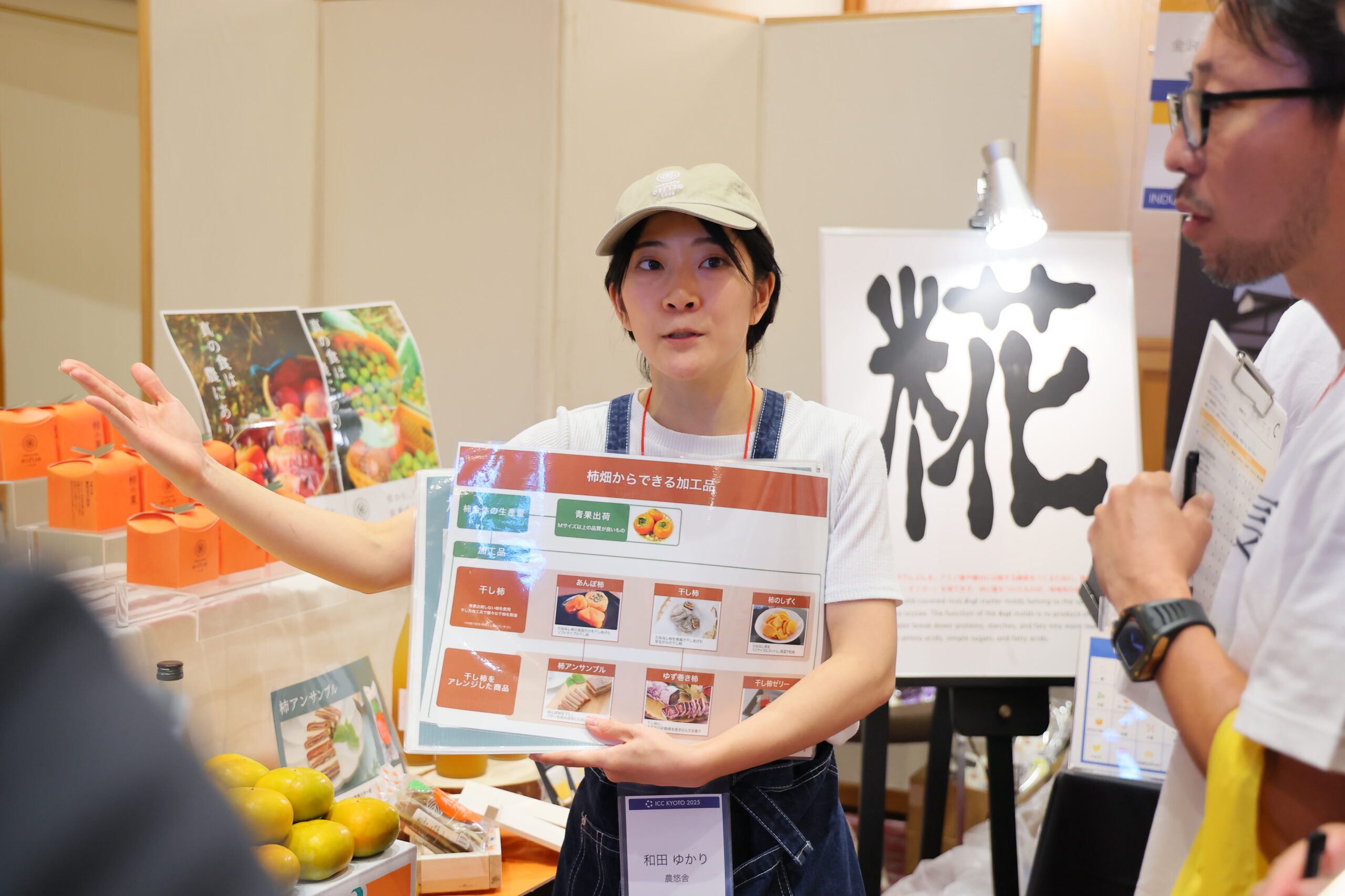柿をセットすると、くるくると皮をむいていく装置に歓声が上がっていた農悠舎。奈良県五條市は全国1位の柿の産地で、小梅の生産も行っている。和田 ゆかりさんの前職はICCでもおなじみ温泉道場だ。