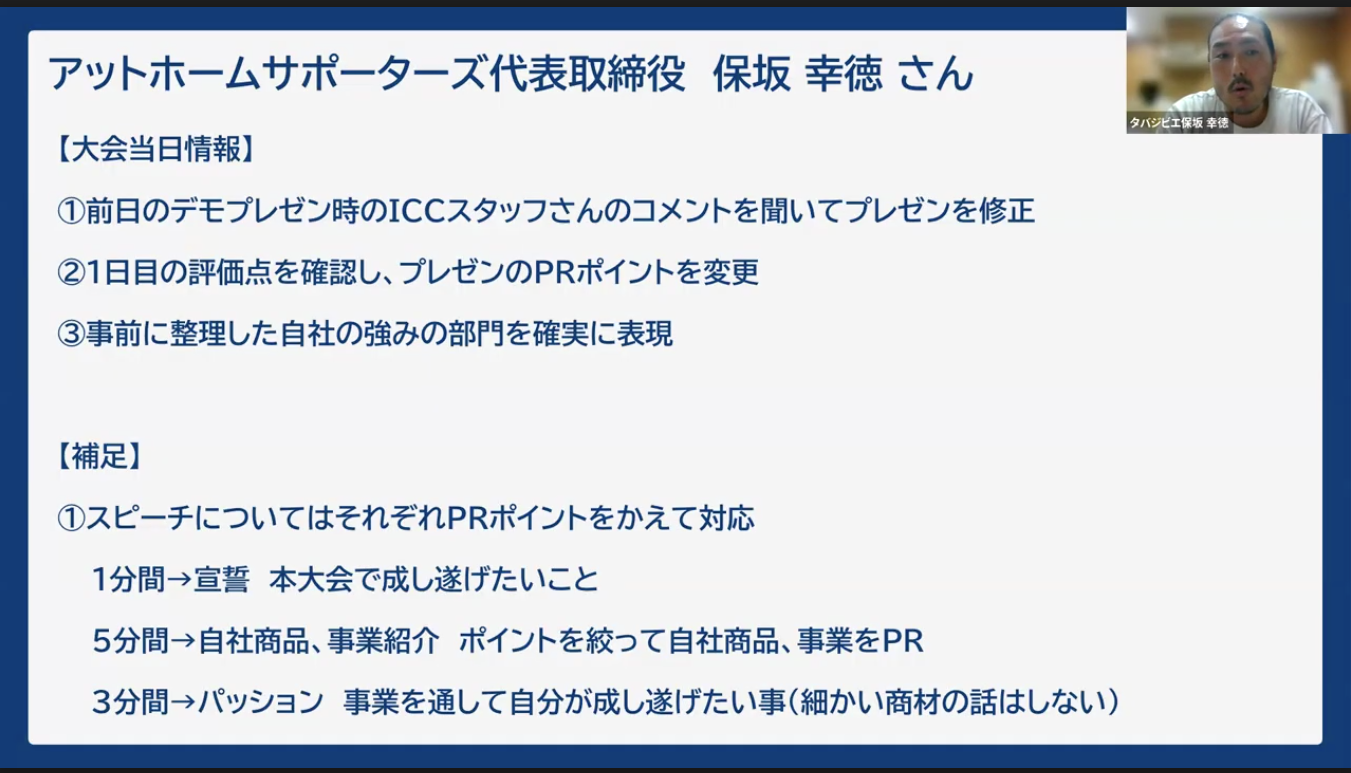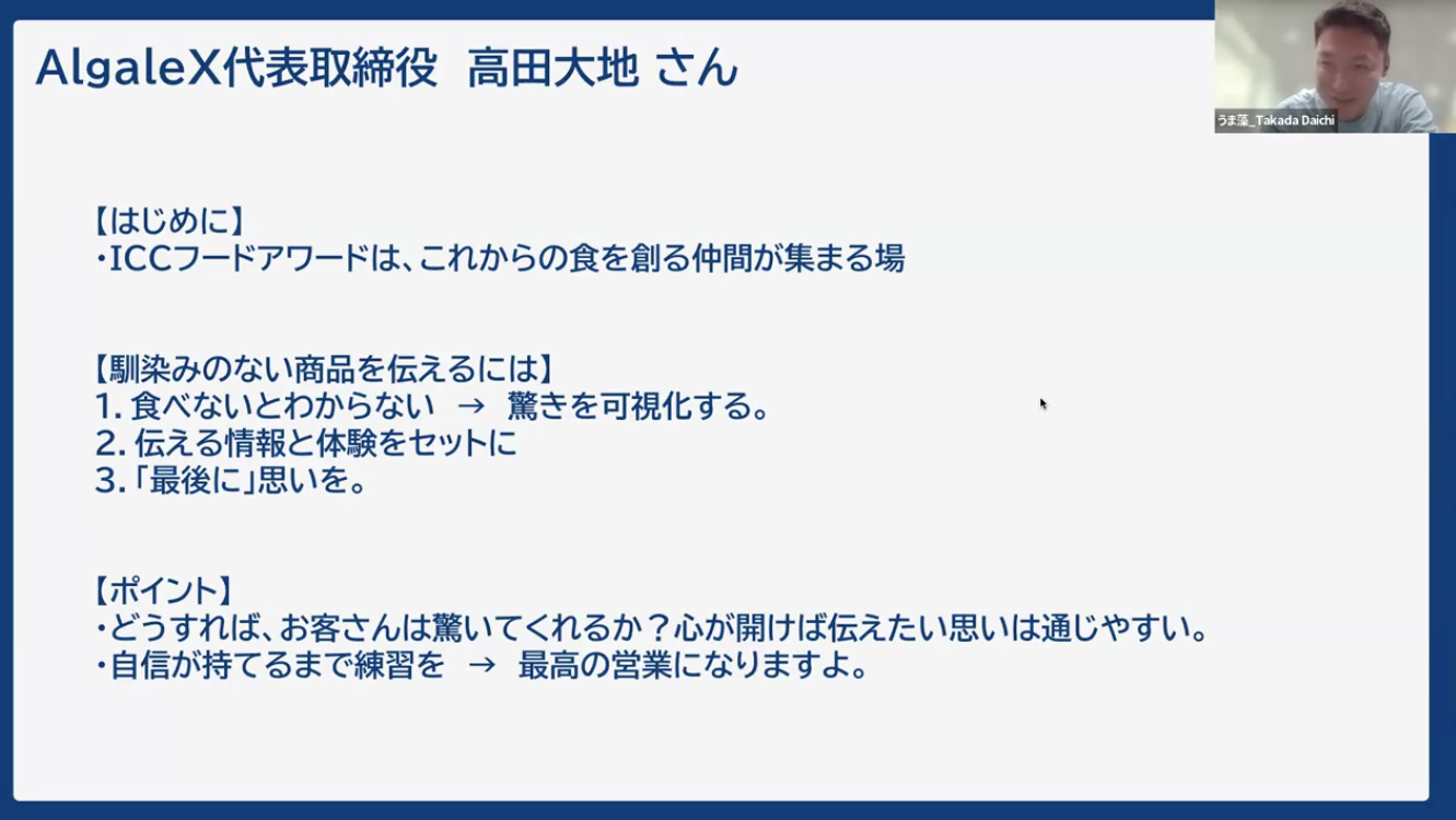 ぜひ皆さん、自分の商品の発表も重要なんですが、アイデアが結構重なってたりするから、そういうところを融合すると本当に共創することができるので、ぜひ皆さん交流を深めて、この価値を最大にしてもらえるといいと思います」