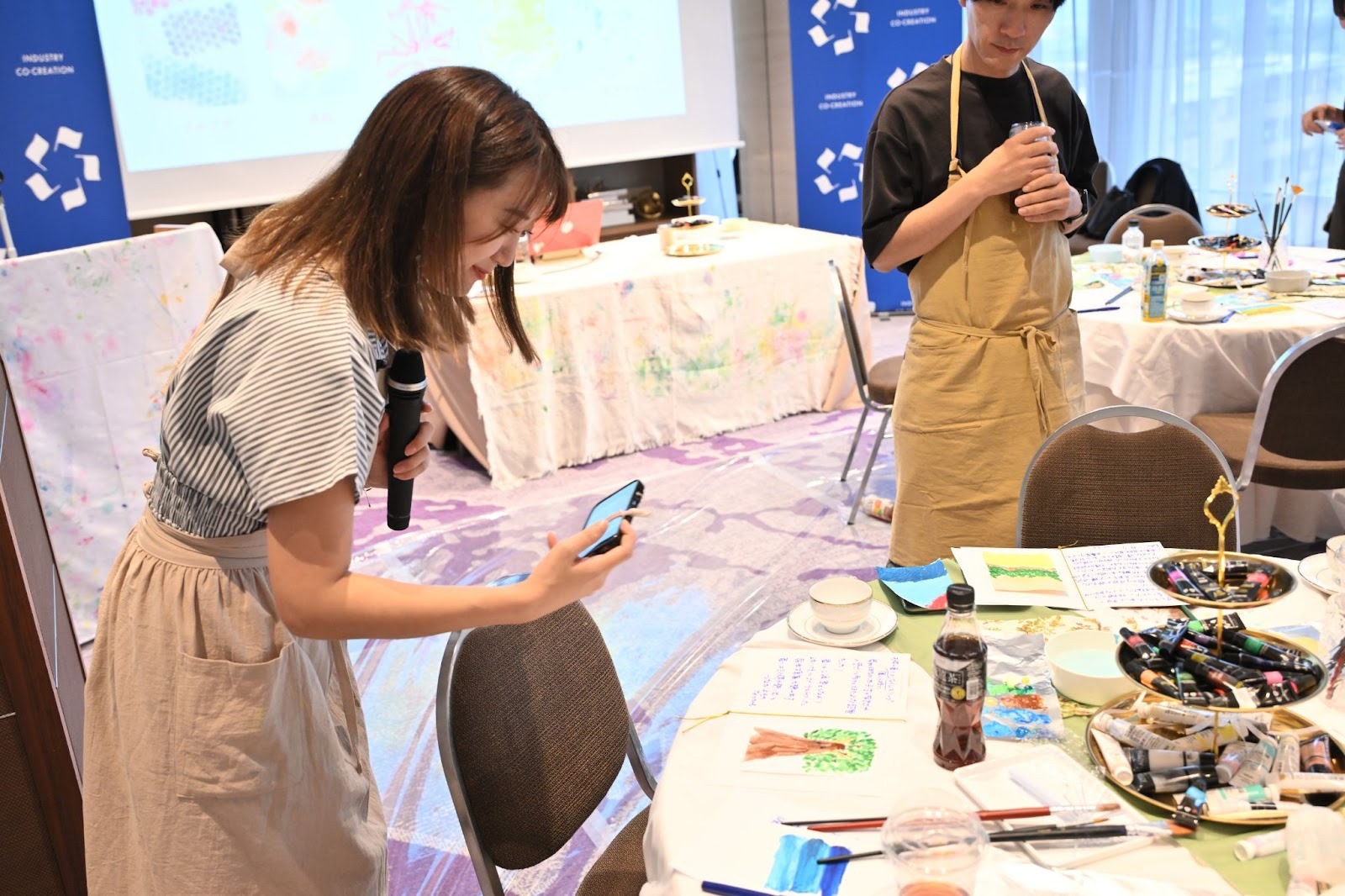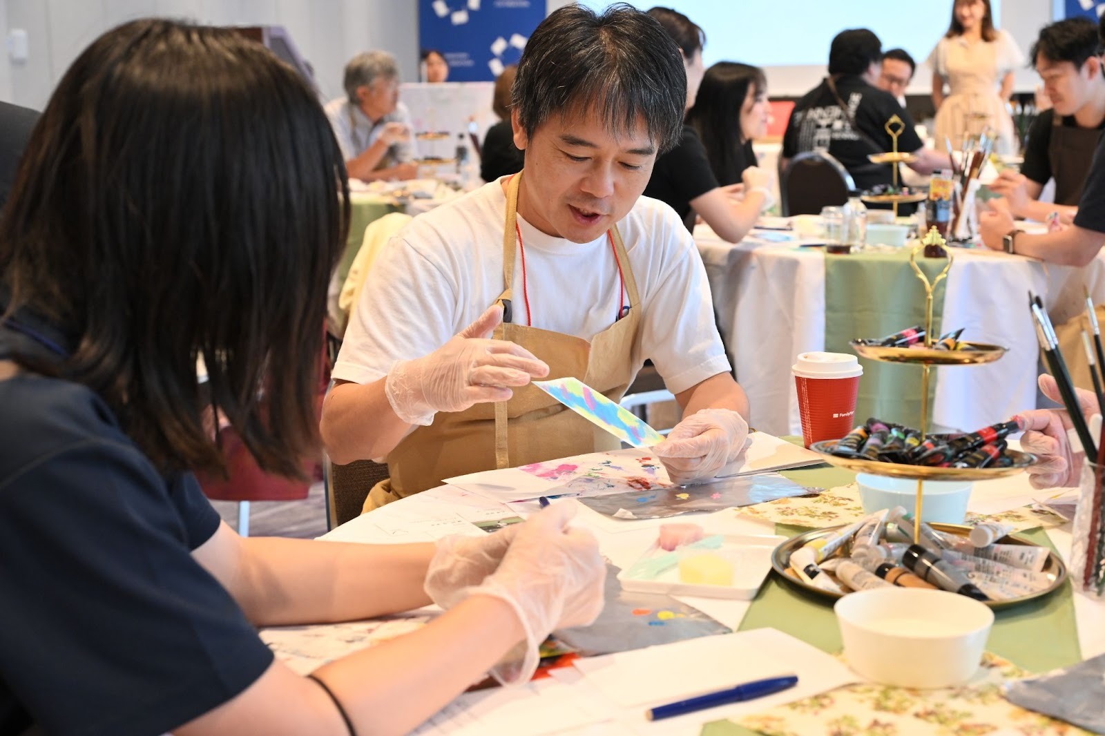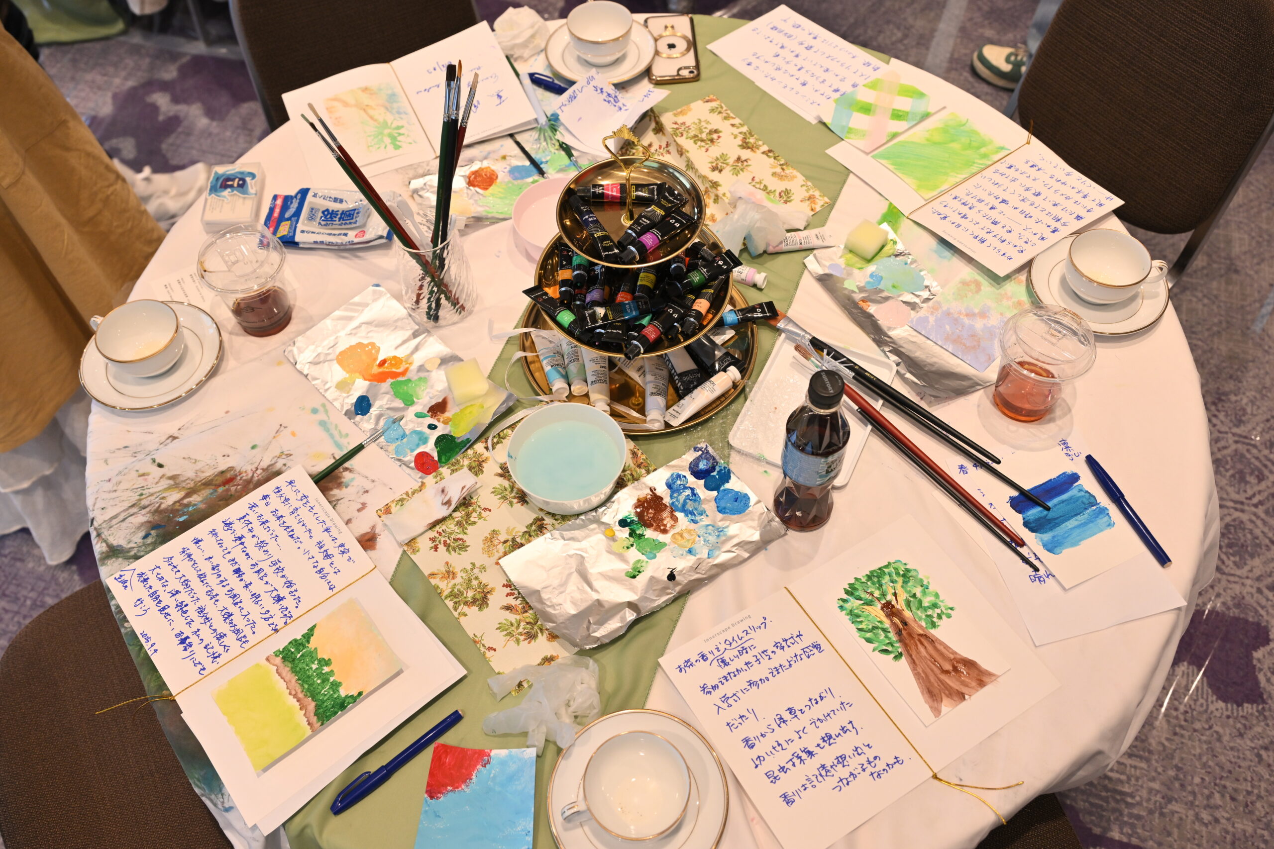 絵筆ではなく指でというのが、人間のプリミティブな喜びを刺激するようだ。色を塗り広げるだけで、会場がぱあっと明るくなったのは、単にテーブル上がカラフルになっただけでなく、参加者たちがこのワークを楽しみ始めているからだろう。