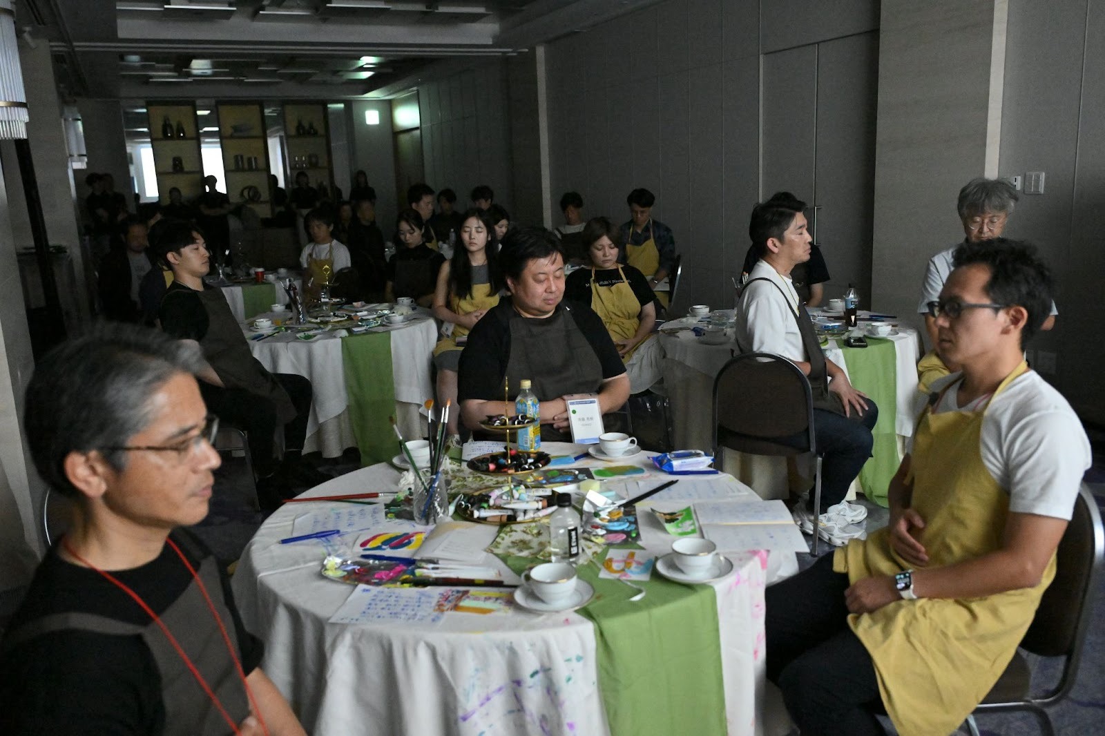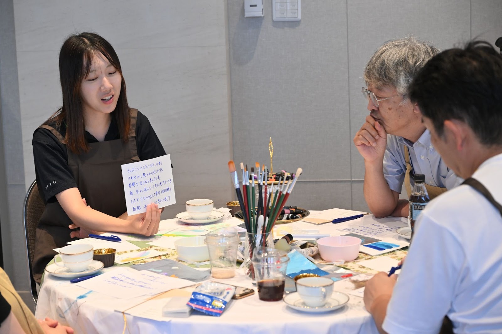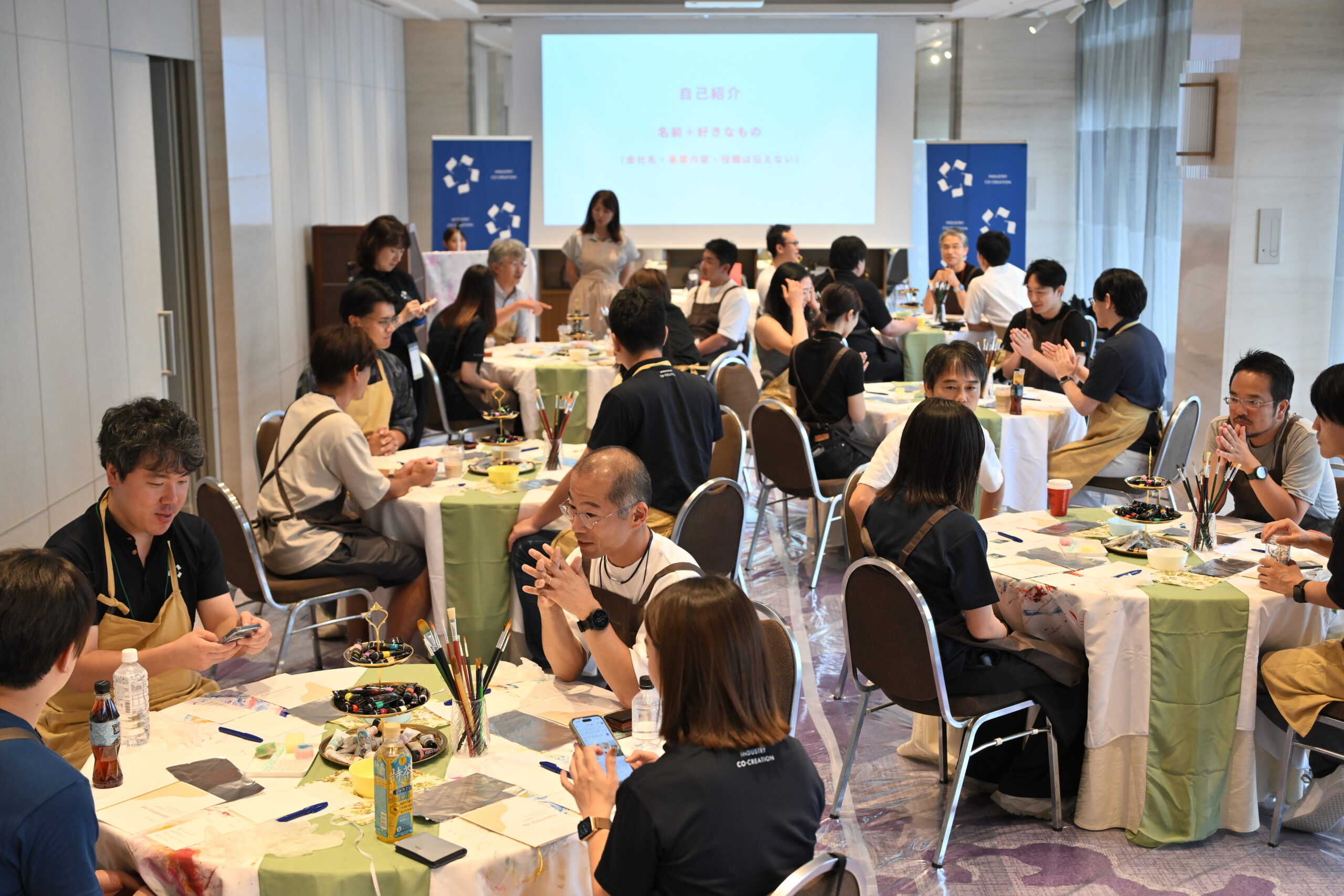 絵筆ではなく指でというのが、人間のプリミティブな喜びを刺激するようだ。色を塗り広げるだけで、会場がぱあっと明るくなったのは、単にテーブル上がカラフルになっただけでなく、参加者たちがこのワークを楽しみ始めているからだろう。