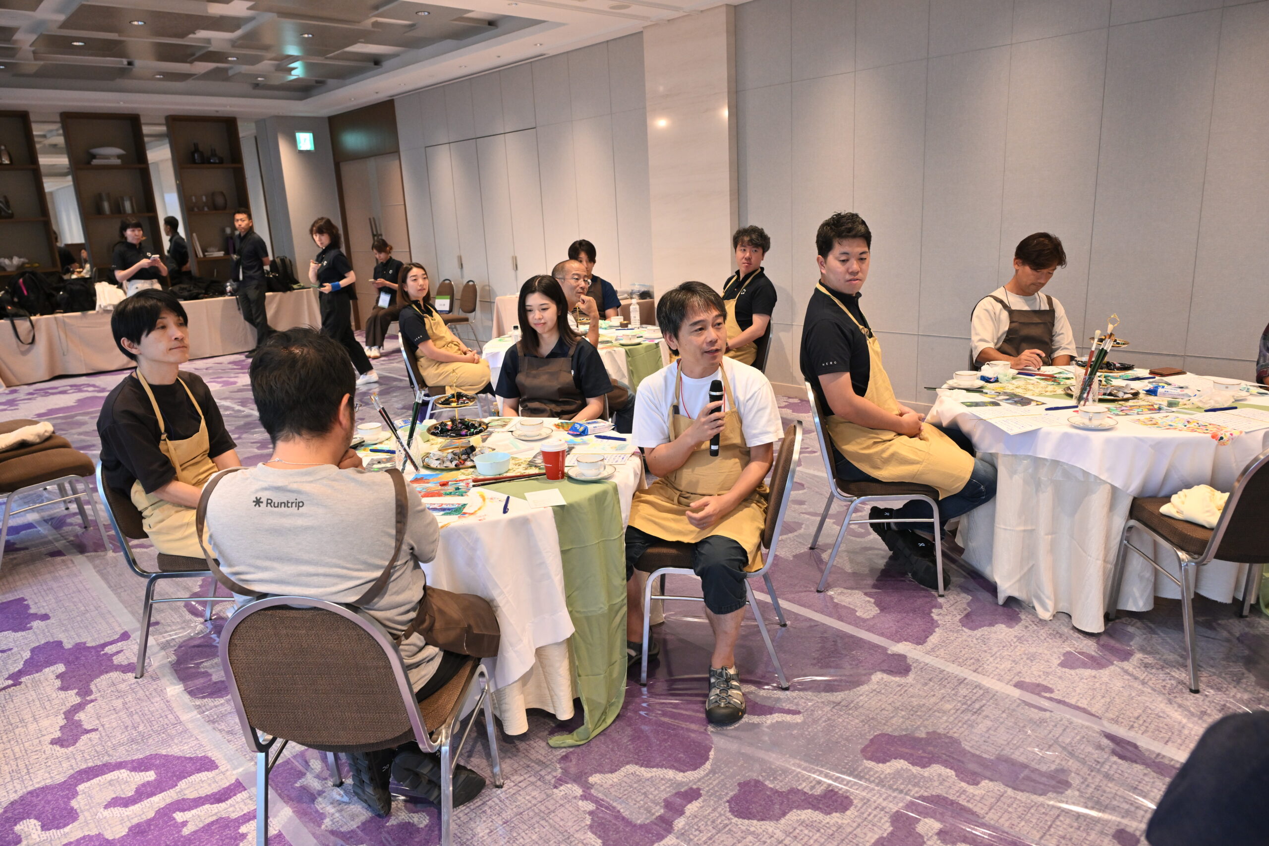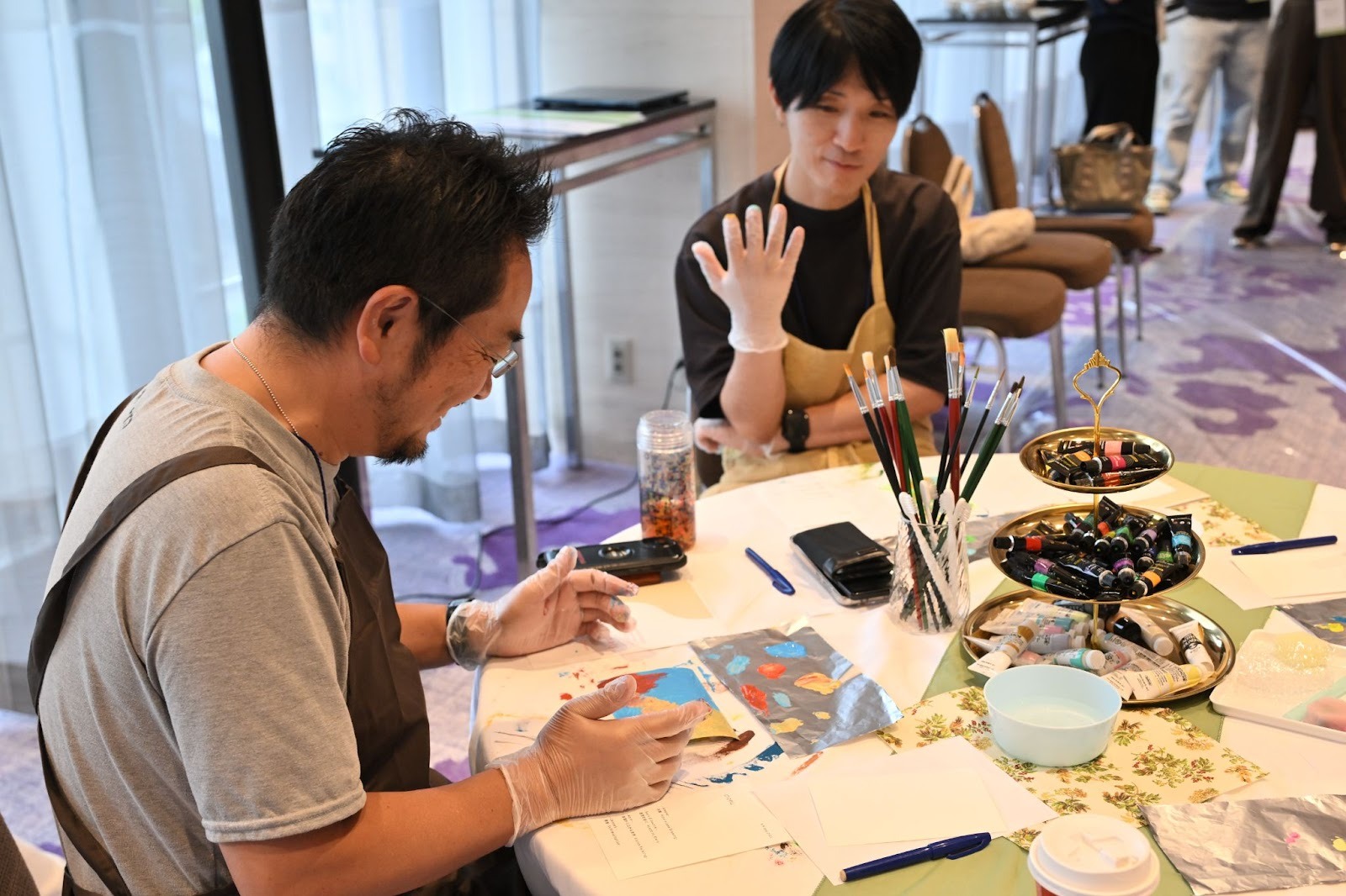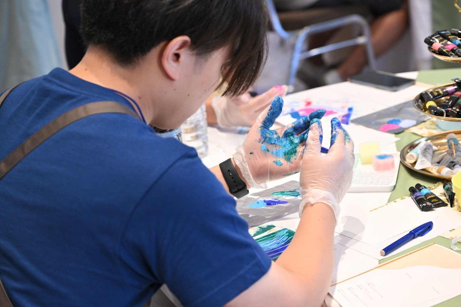 次のワークに移ると言われた参加者たちは、渋々といった表情で手袋を外した。ここで久しぶりに絵の具を触った人も多いだろうに、すっかり絵の具を使うのが楽しくなってしまったようである。