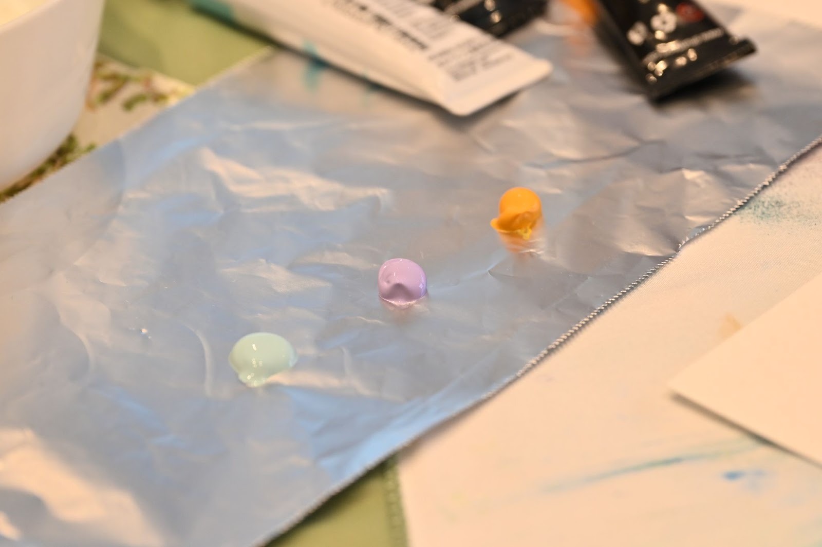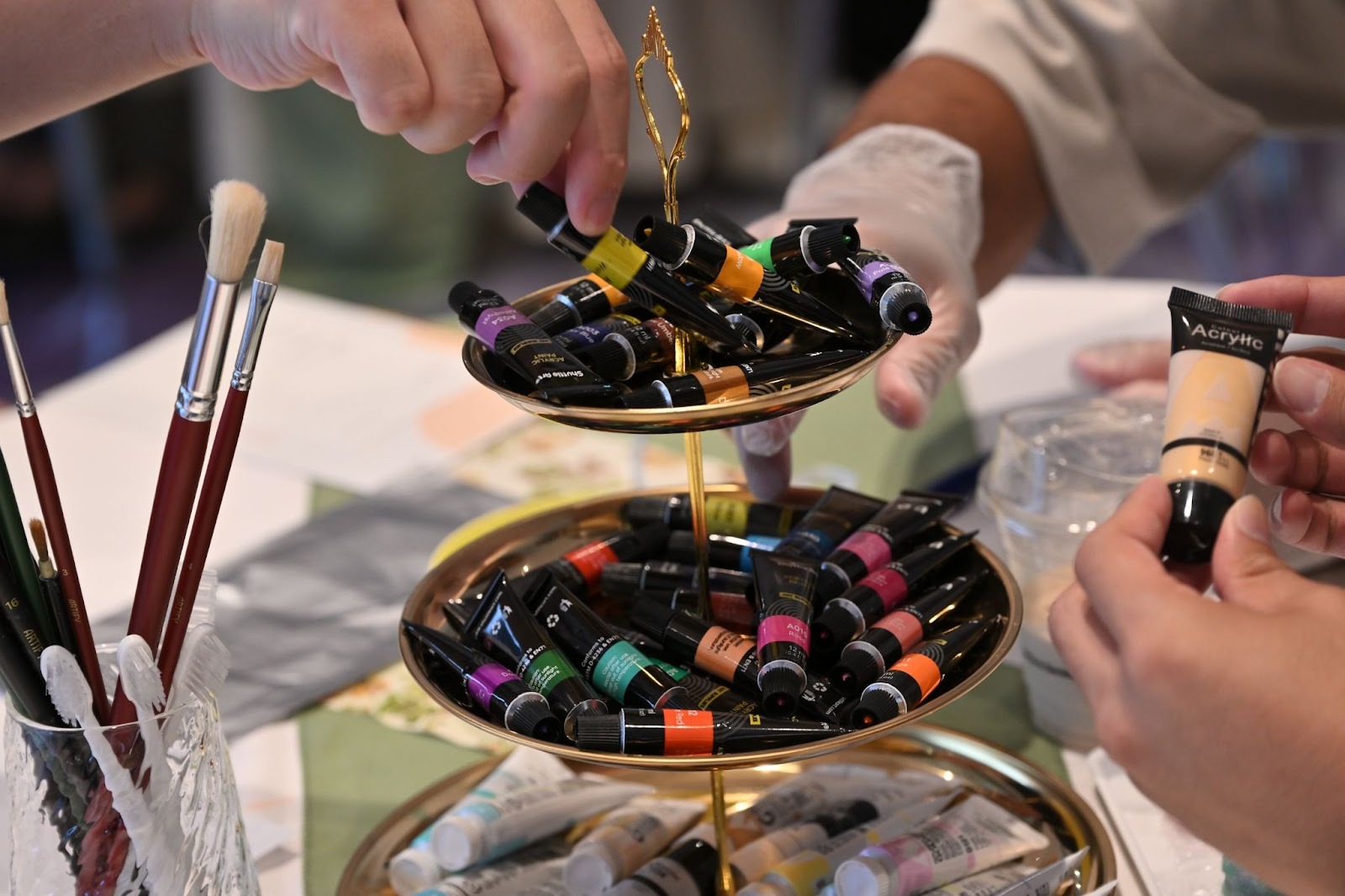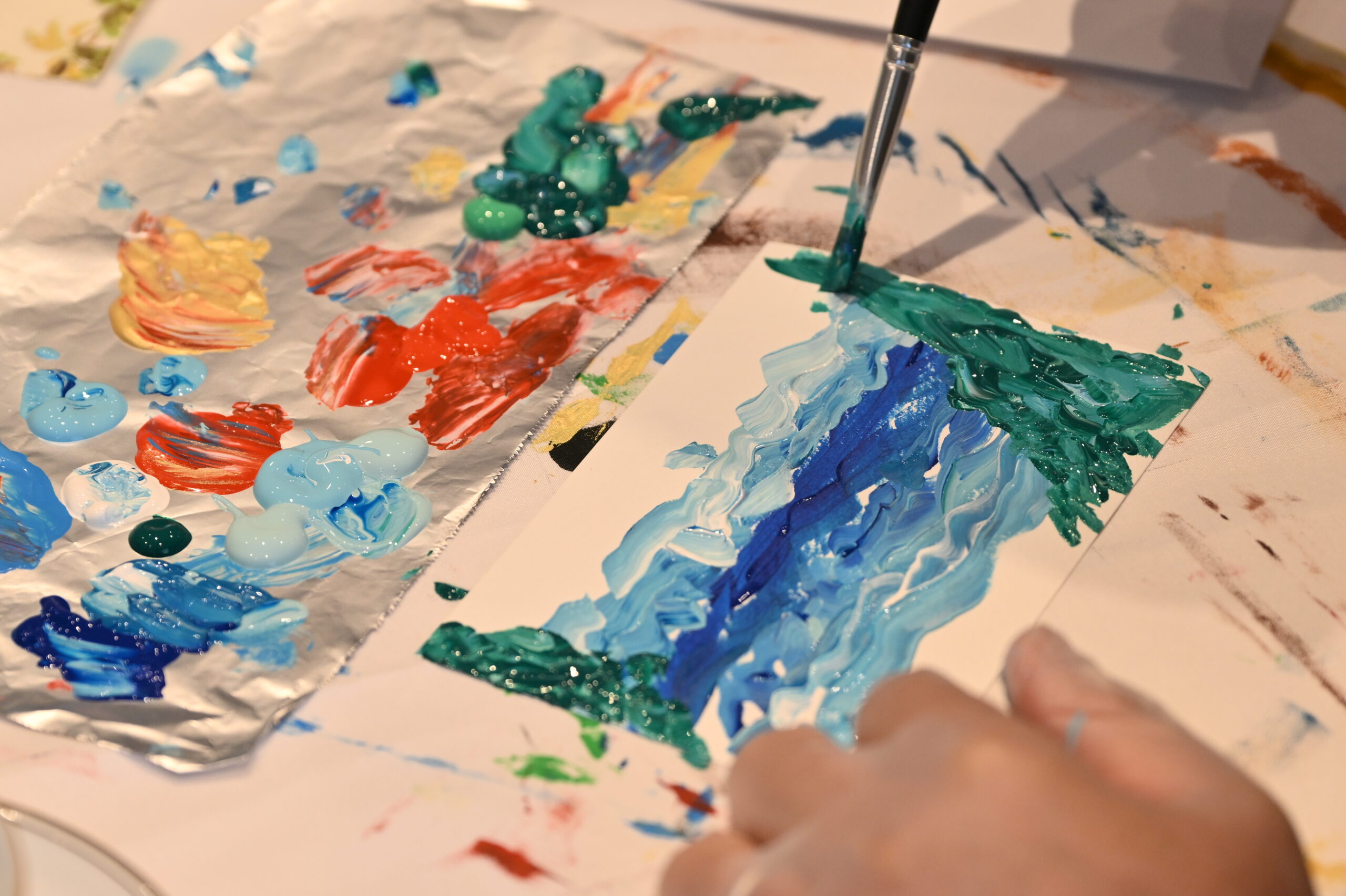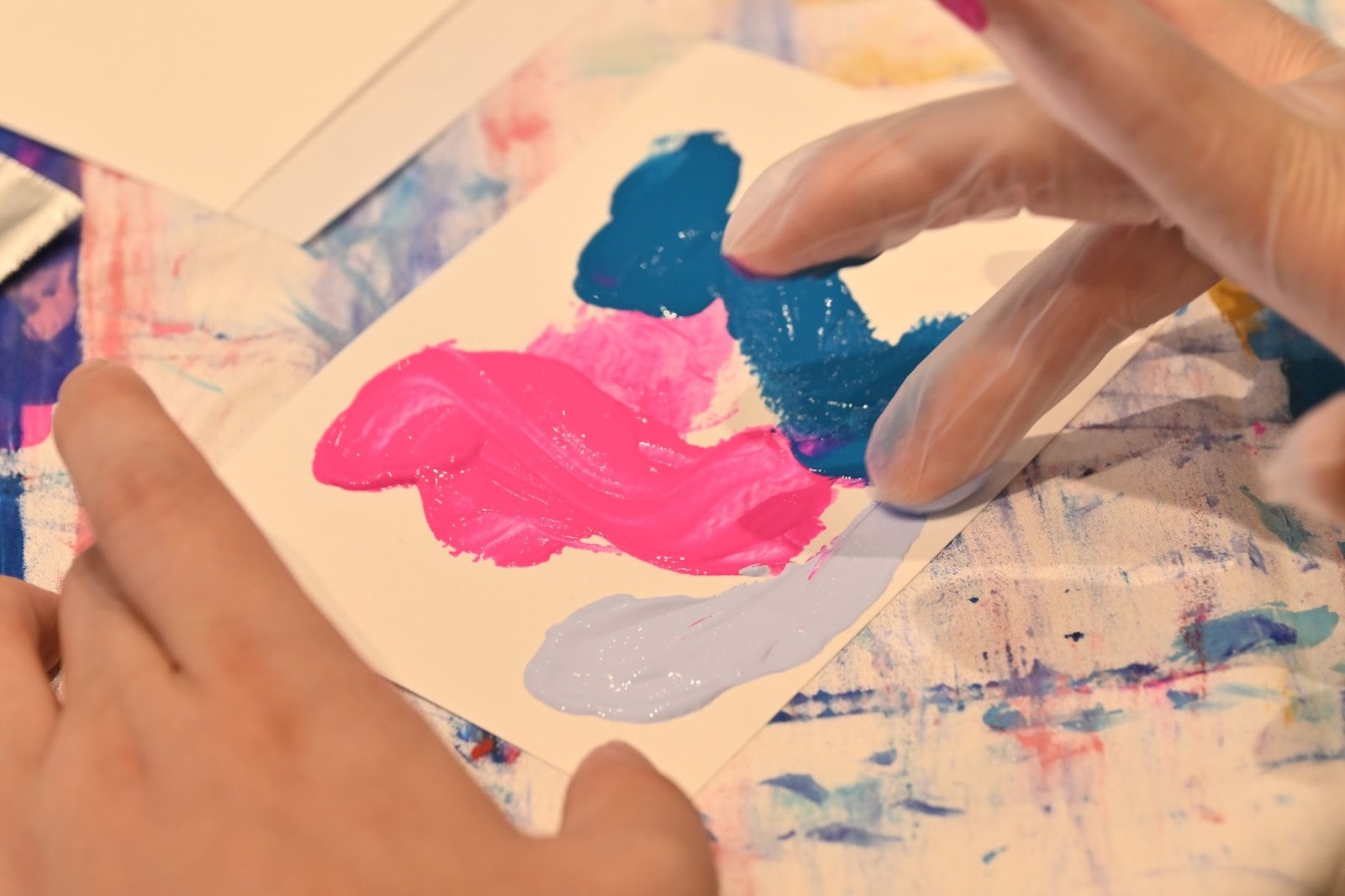 用意された絵の具のチューブから好きな3色を選び、指で感じるままに描いていく最初のワークは、何を描くという特別なテーマはなく、きれいだなと思ったその感じのままに、色を並べてみるでも混ぜるでも重ねるのでも何でもOKで、やり方は自由。最初こそ参加者たちは戸惑っていたが、だんだん夢中になって色を重ねていく。