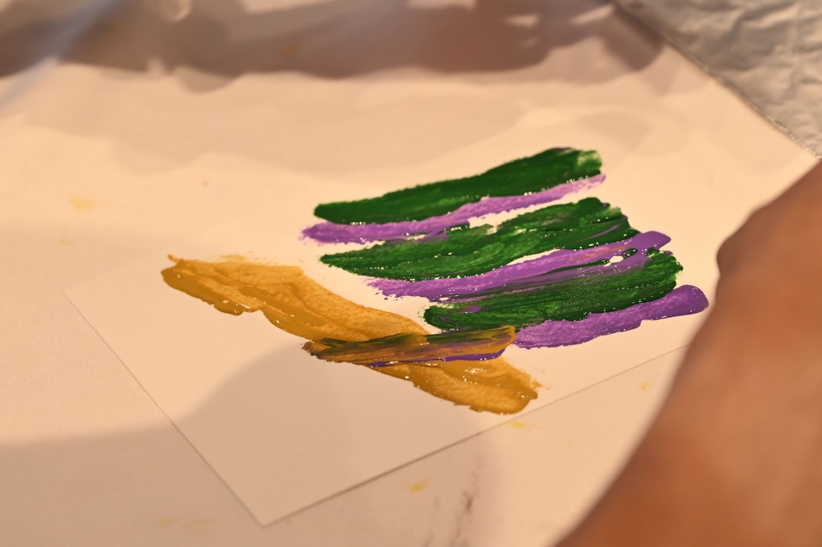 「頭に浮かんだ色を3つ選びました。手で絵の具を触ってみたくて、シュッと描いてみたくて。水を混ぜてみたらどうなるか、置いたらどうなるか。まっすぐなものやシンメトリーのもの、変化のないものが苦手なので、画面には空間ができました」