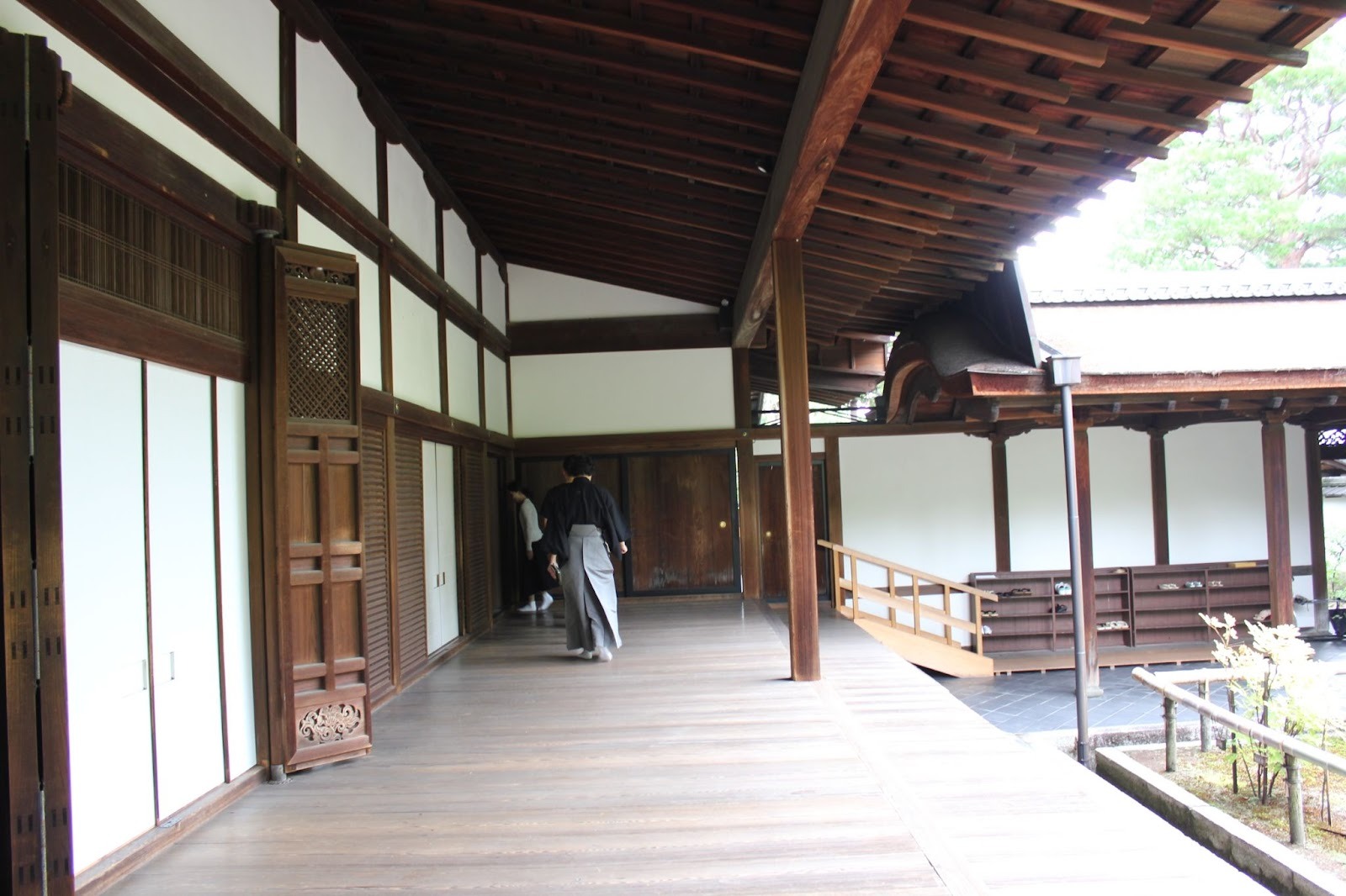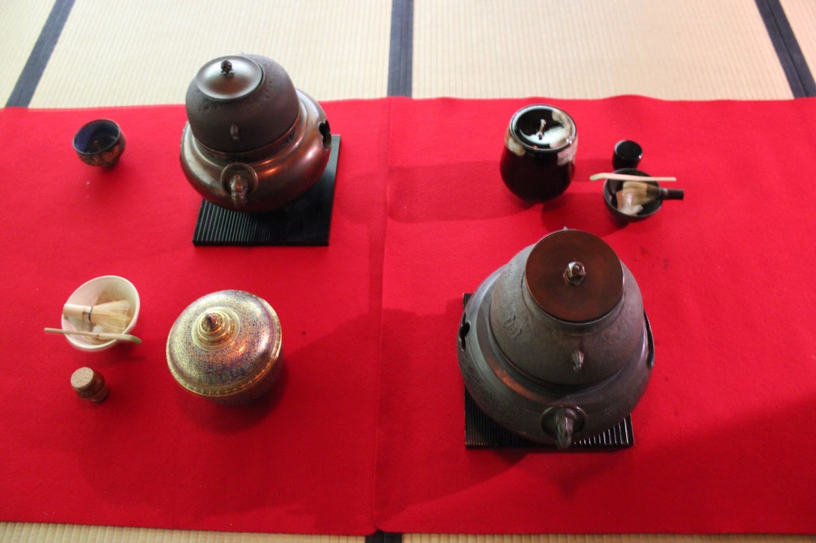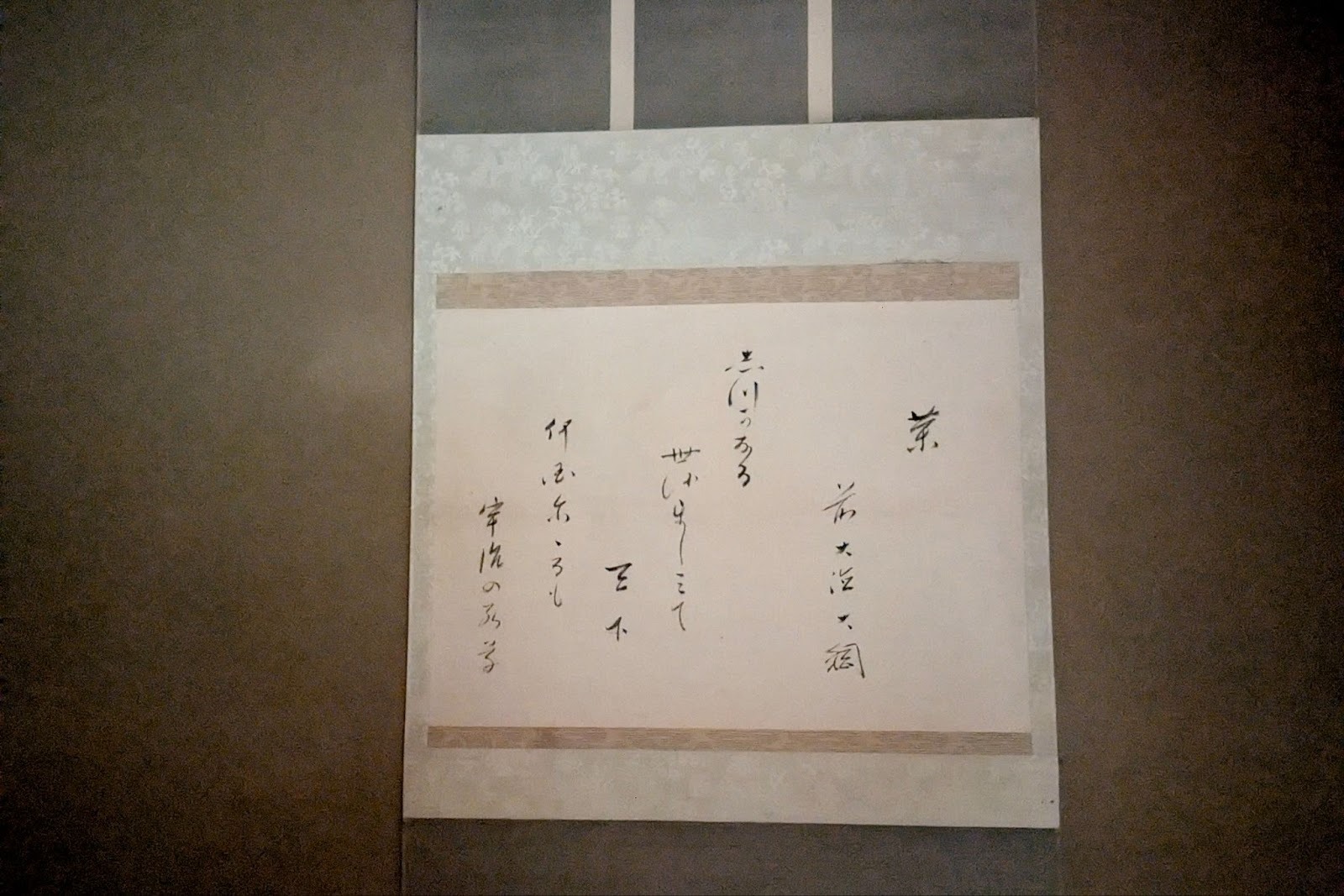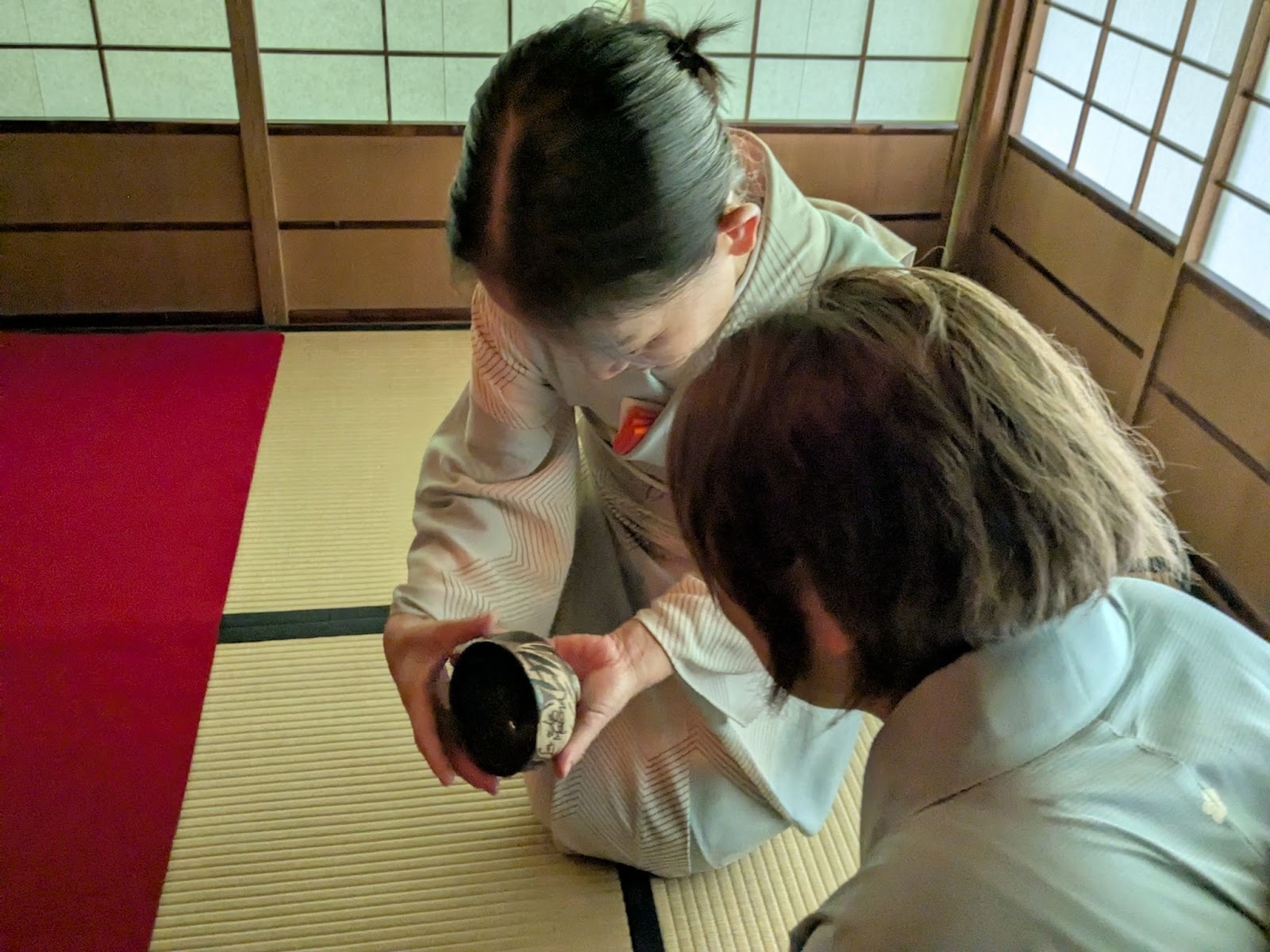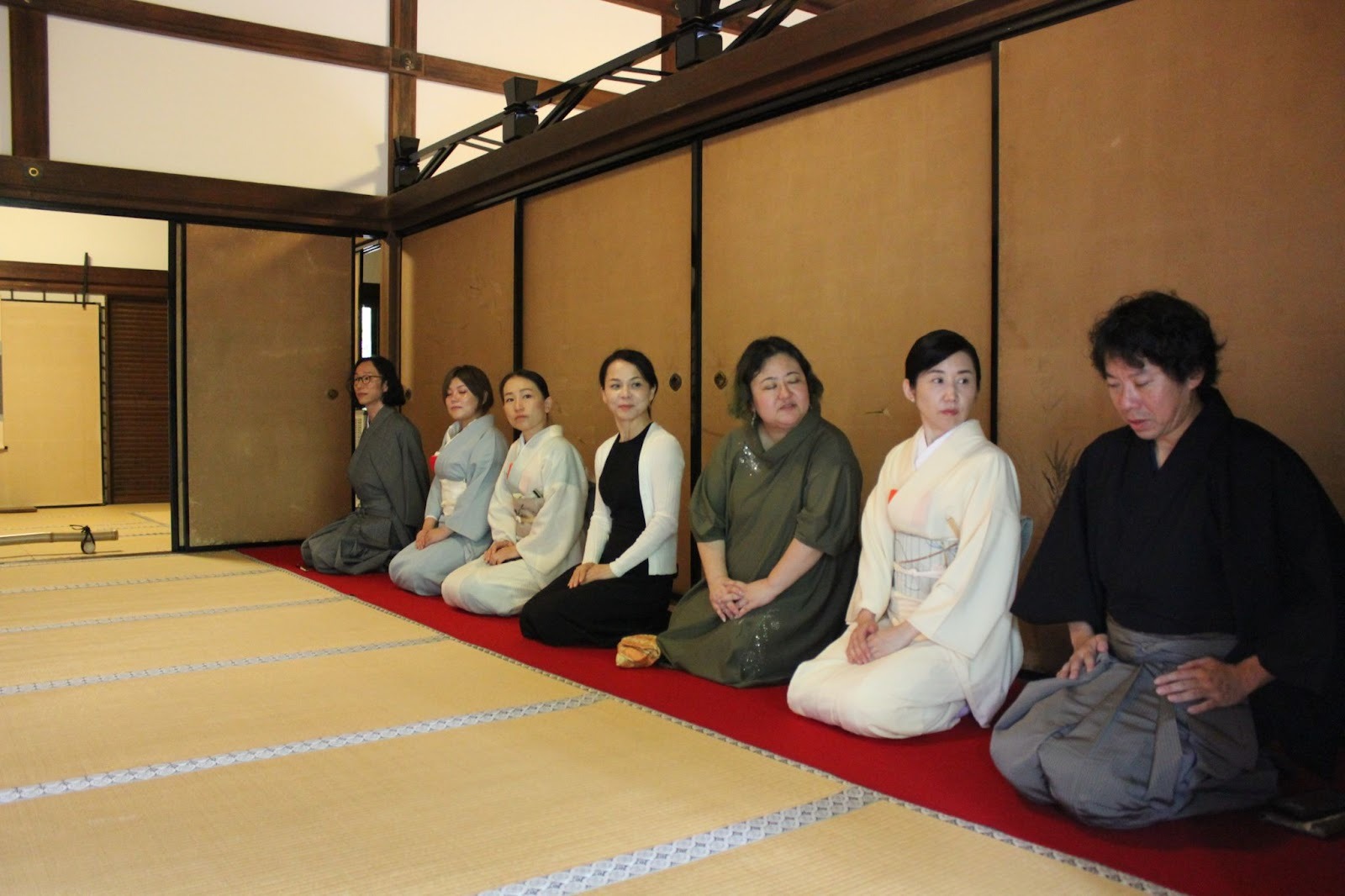 写真でご紹介はできないが、これらが飾られた部屋の左右の屏風には、狩野探幽によって1669年に描かれた襖絵を見ることができた。こちら、重要文化財。茶道の聖地で、貴重な文化財に囲まれての茶会、客の全員が揃ったところで、一行は最初の部屋へと移動した。