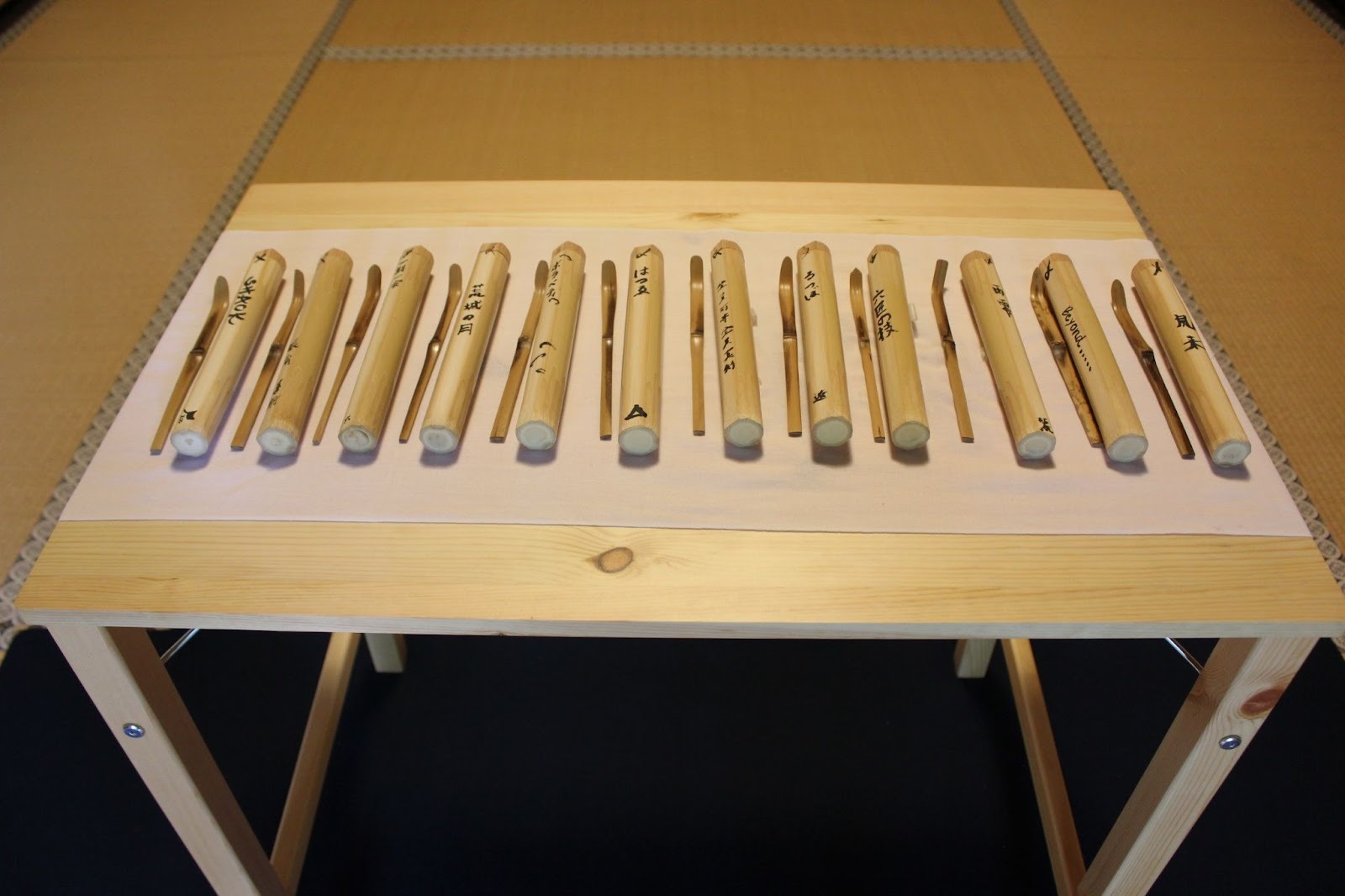 その手前の机には、前回福岡でのCo-Creation茶会で参加者たちが作って名前を付けたた茶杓が並べられている。
