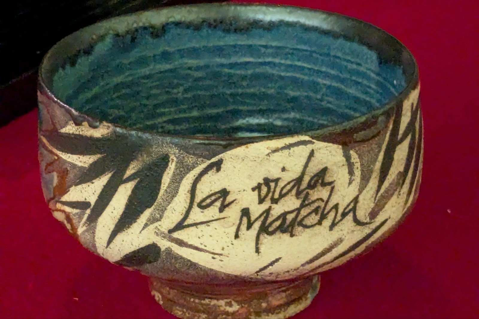 アルバさんはスペインのご出身、担い手とそれぞれの趣向で、一期一会の空間を作るのがお茶席ですので、それにならって今日はスペインのものを取り揃えています。棗の代わりに使っている茶器もスペインのマヨルカ焼きです。