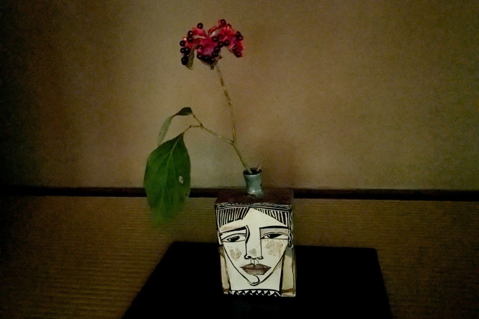花入はマラガというスペインの地域で活動をされている作家さんがいらっしゃるのですが、ピカソを模したような作品で、ずっと見つめられているようで面白いなと思いながら、調達してきたものです。