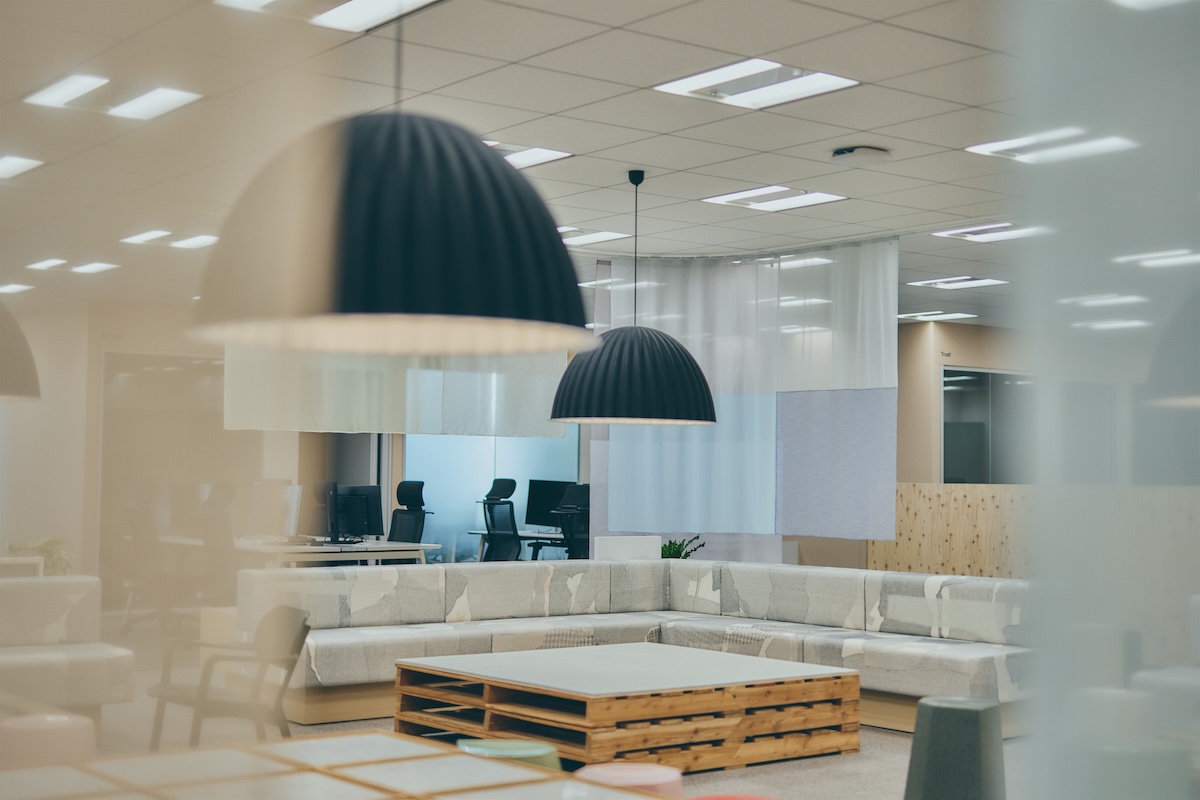 執務スペースは、訪問した月曜日に出勤するチームが勤務中。チームごとにまとまっているところもあれば、共有スペースのソファやカフェで仕事をしている人たちもいる。