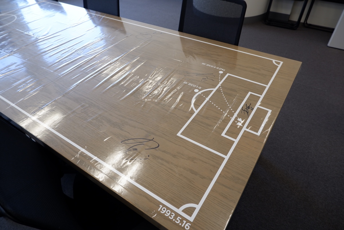 佐々木さん「1993年にジーコ選手がハットトリックを決めた伝説の試合がありまして、その時のゴールの図面をテーブルに。入っているサインは、アントラーズの選手たちが来た時に書いてもらいました。