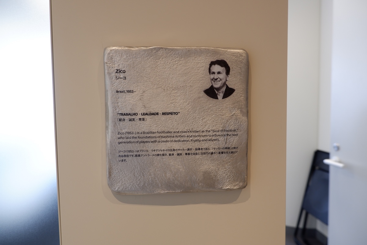 伝説のハットトリックのジーコの位置をマークしたテーブルと、会議室名のプレート
