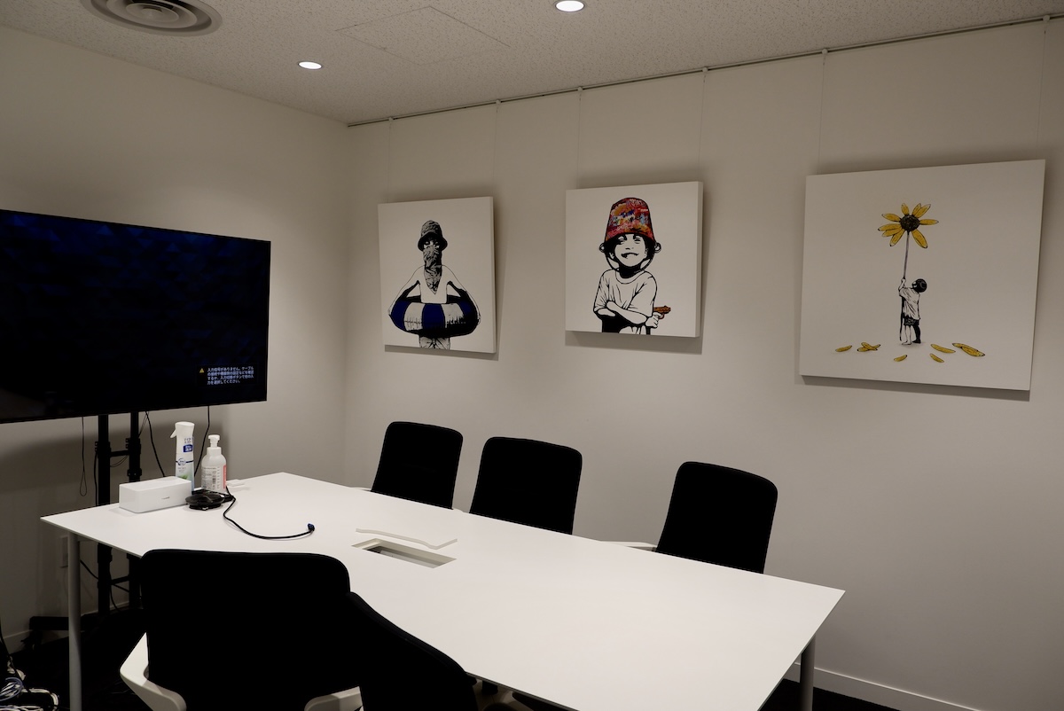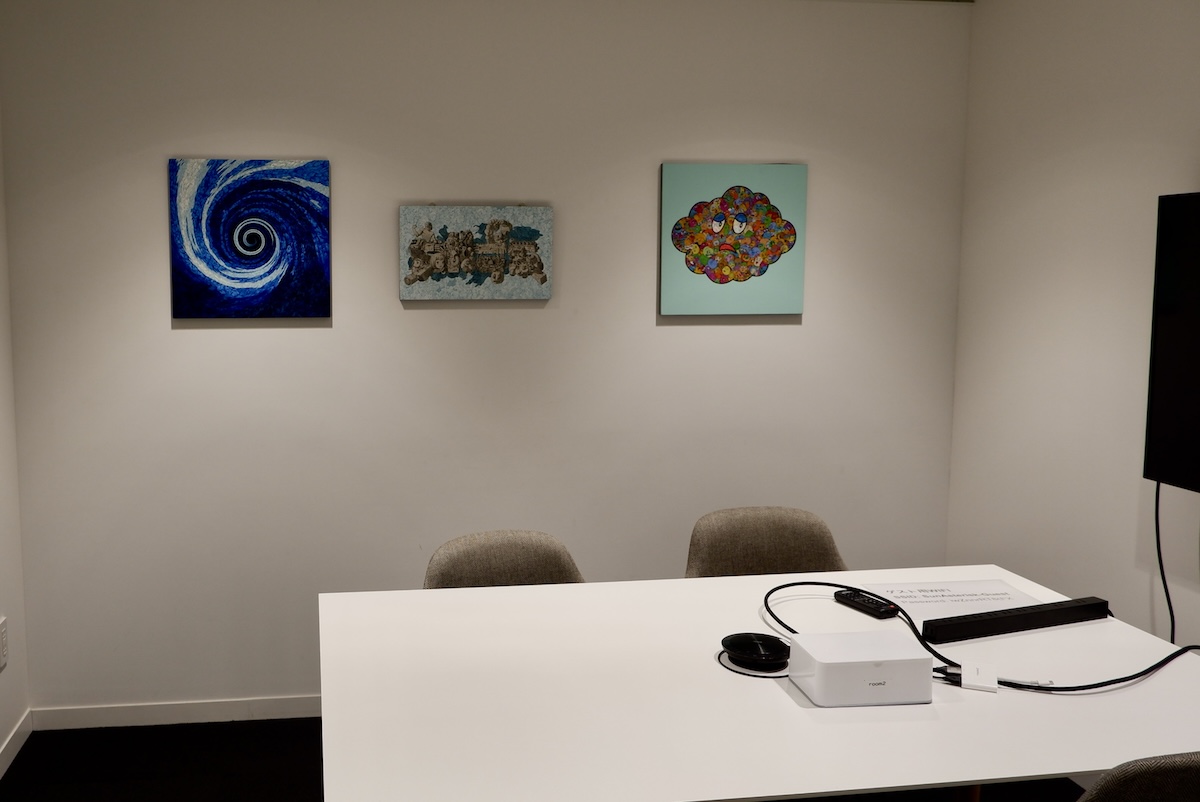 来客用のスペースから執務エリアに入ると、明るく、普通のオフィスの落ち着きもありながら、所々にユニークなこだわりがある。来客用の会議室にも共通しているが、会議室の壁には様々なアートが飾られており、本物の植物が元気に育っている。