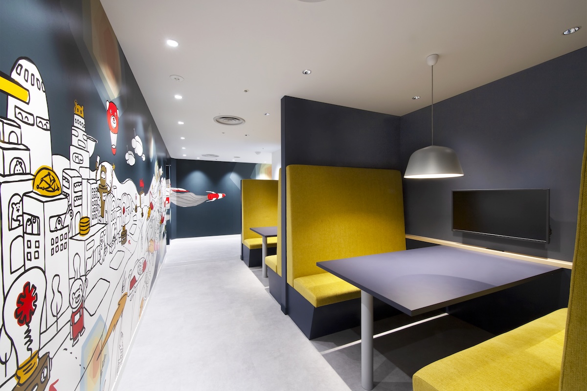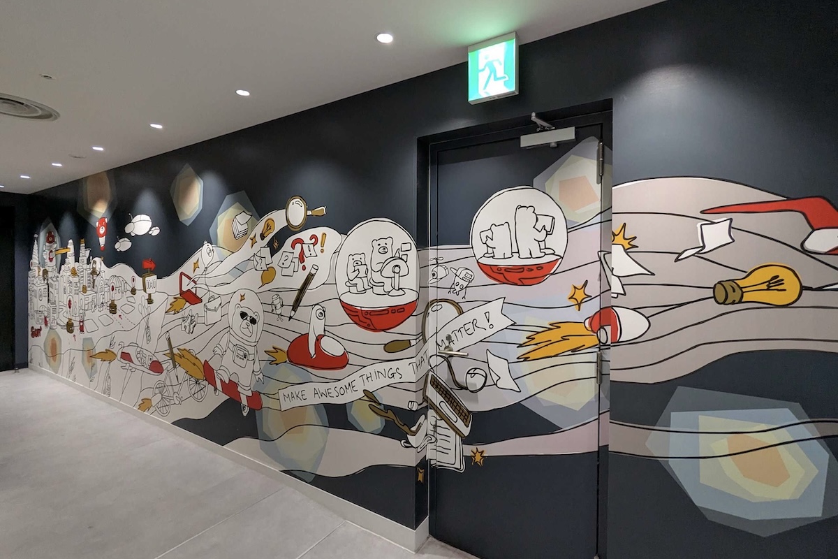 この壁画は宇宙みたいな感じで、暗いところからどんどん出発していくみたいな、飛び立つみたいなテーマで、社内のグラフィックデザイナーが描いています」