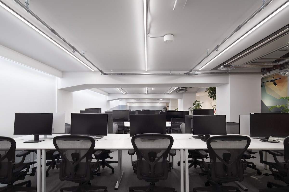 デスクが並ぶエリアは長いテーブルにモニターが並ぶフリーアドレス式。椅子に腰掛けると蛍光灯が整然と並んで見えて、基地感があるという。