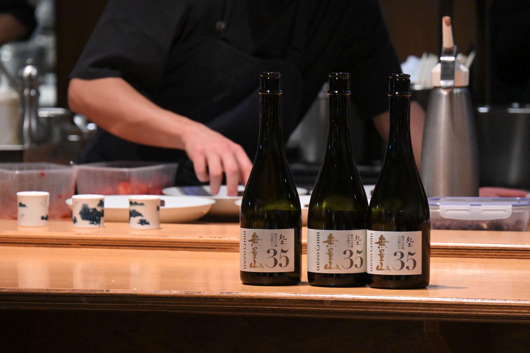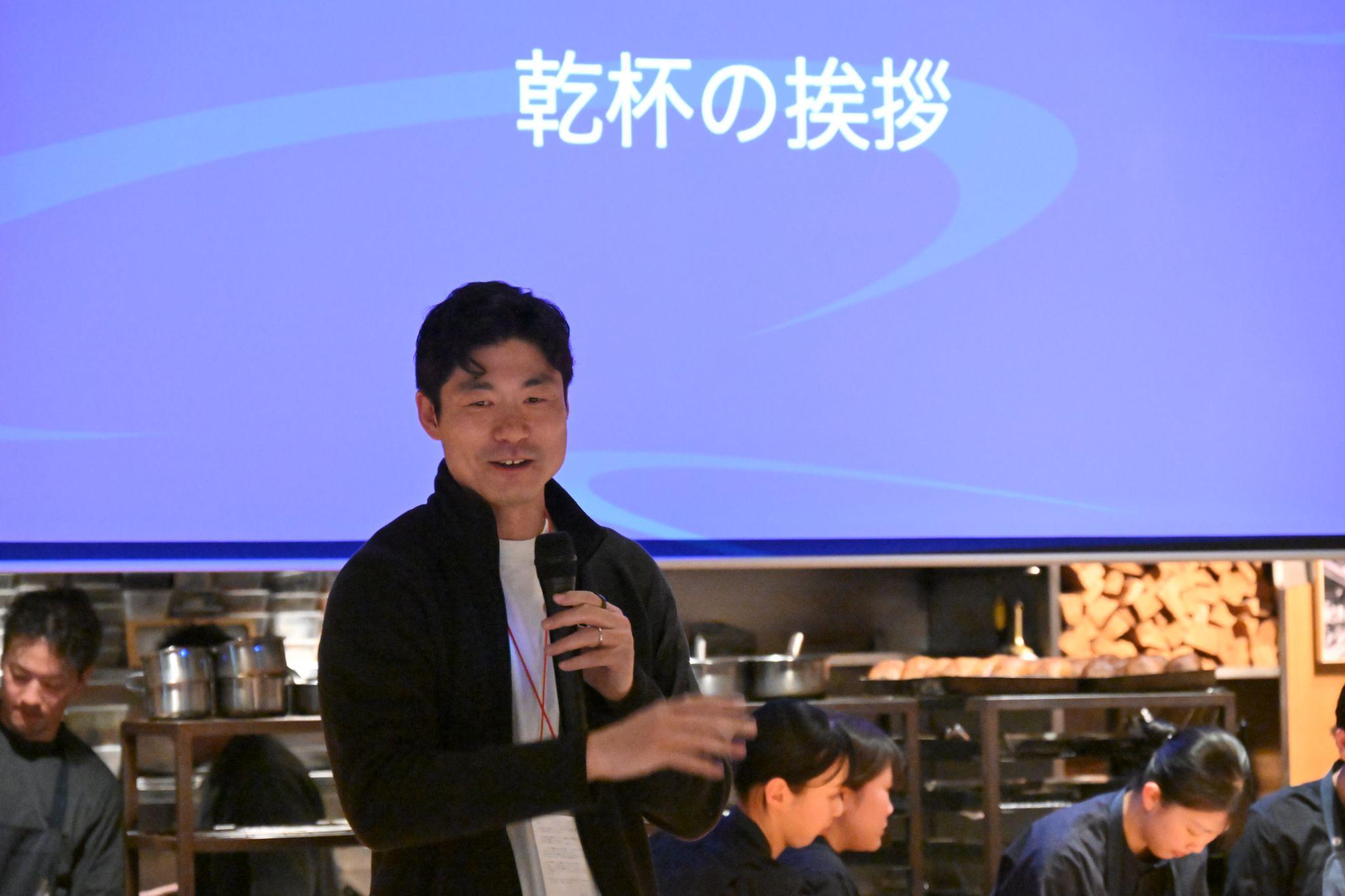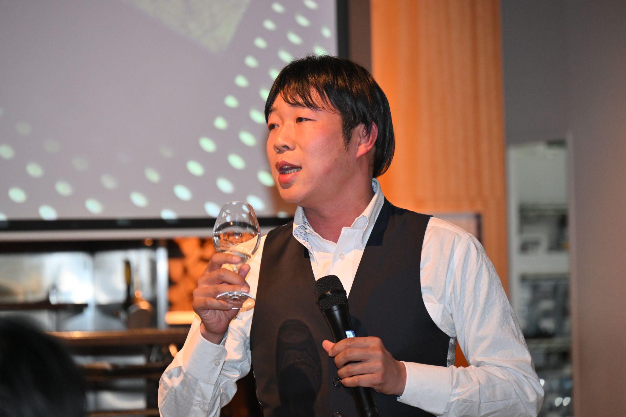 再び平和酒造の山本さんがマイクを握り、メイン料理にぴったりの日本酒「無量山」での乾杯を促した。