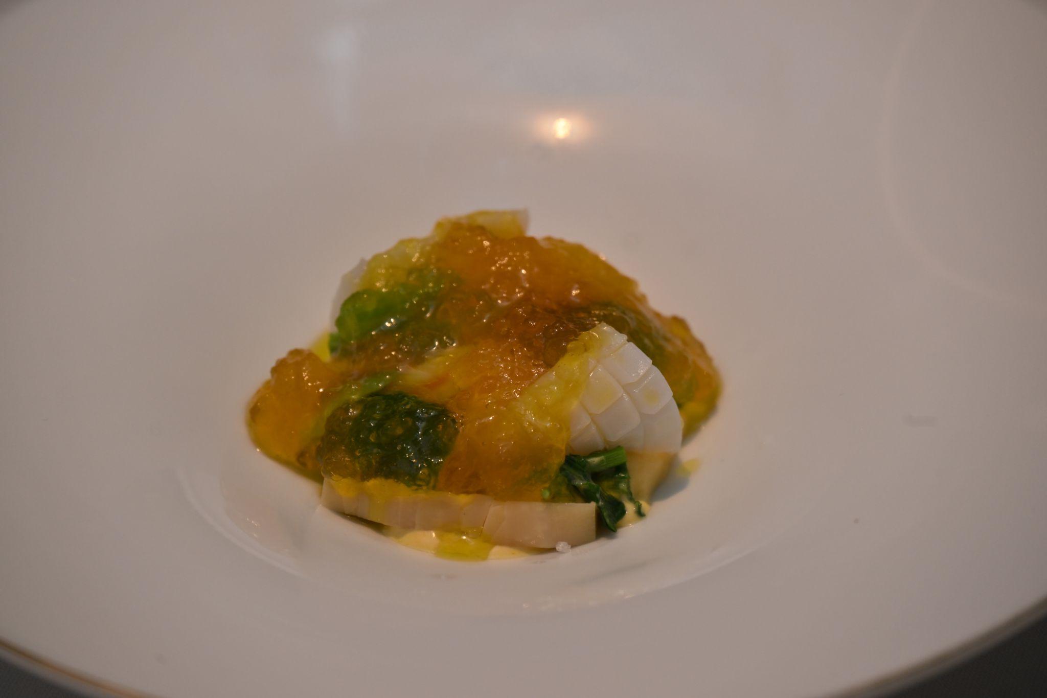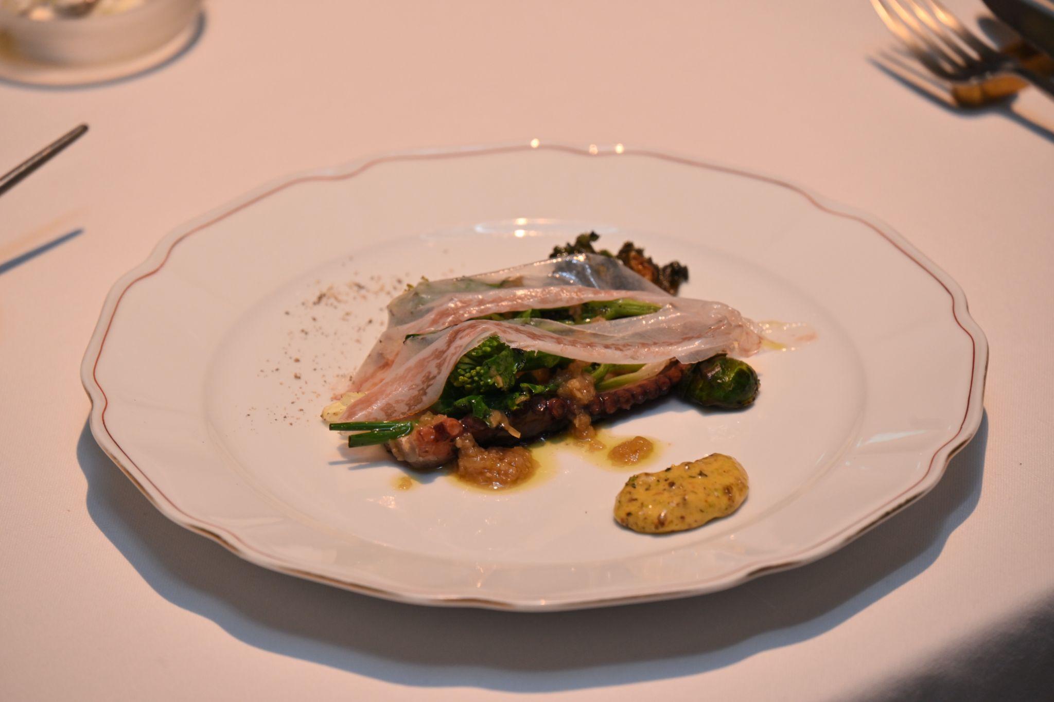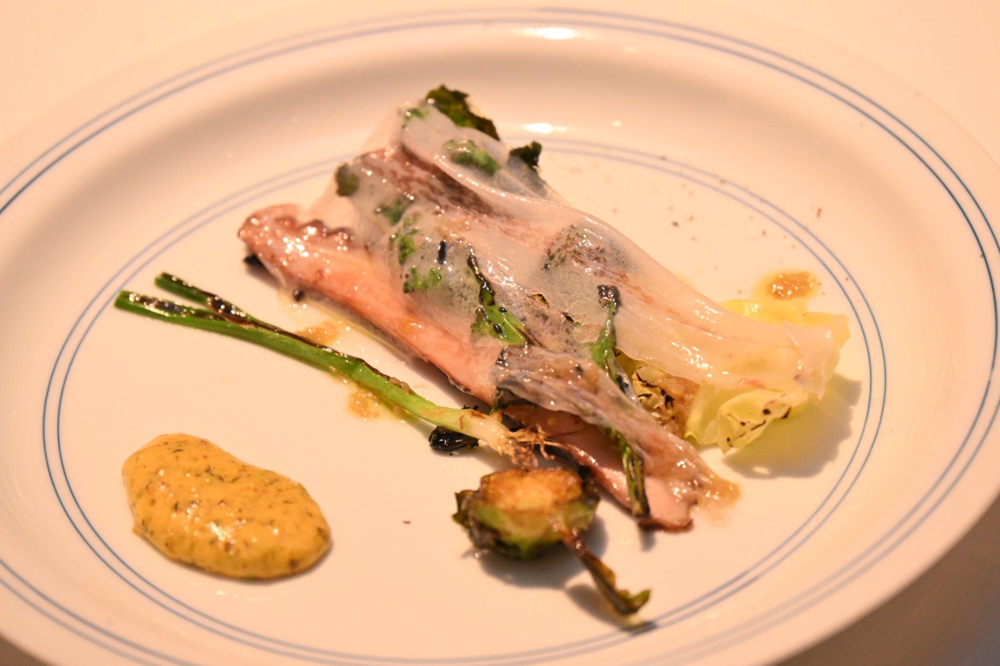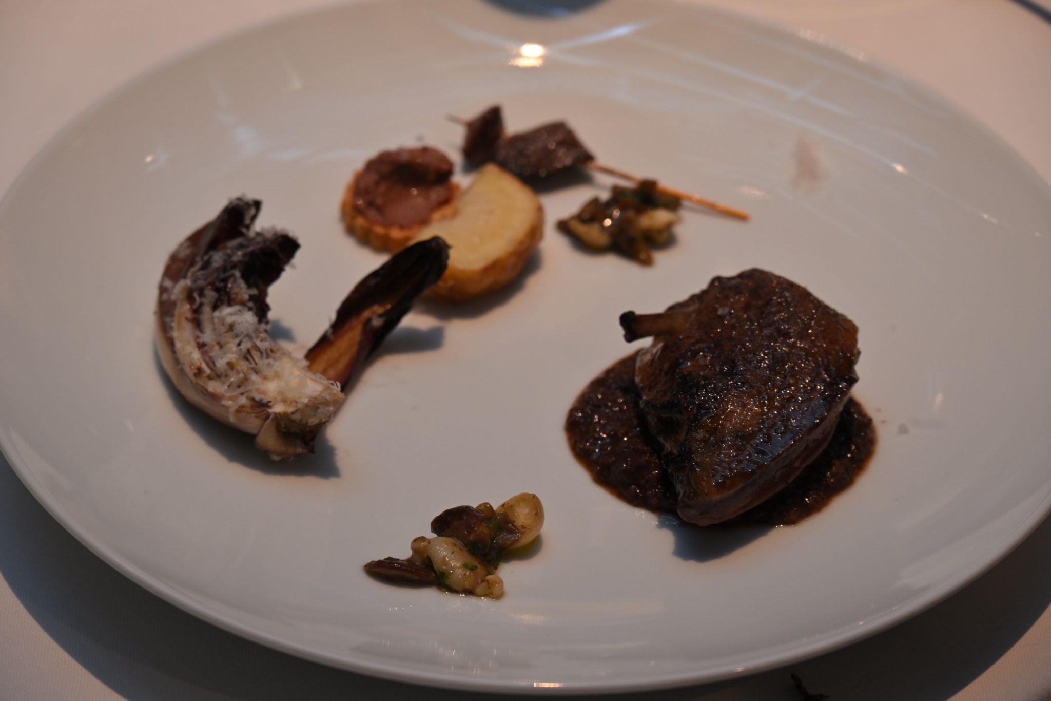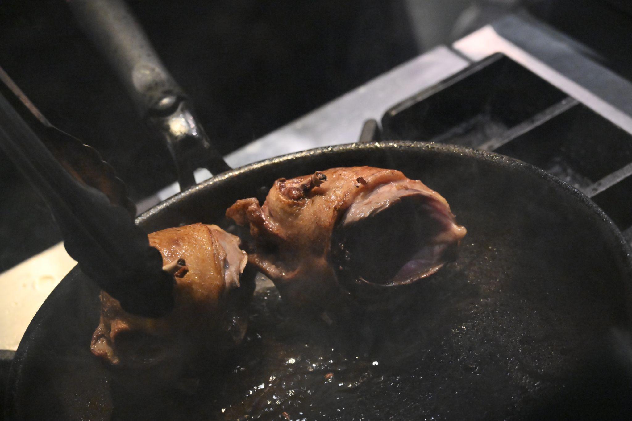 キッチンでは、1店を休みにして集められたという大勢の人たちが46名分のディナーの準備で大忙し。吉武さんは、この日のメイン肉料理である鳩の調理にかかりきりだ。