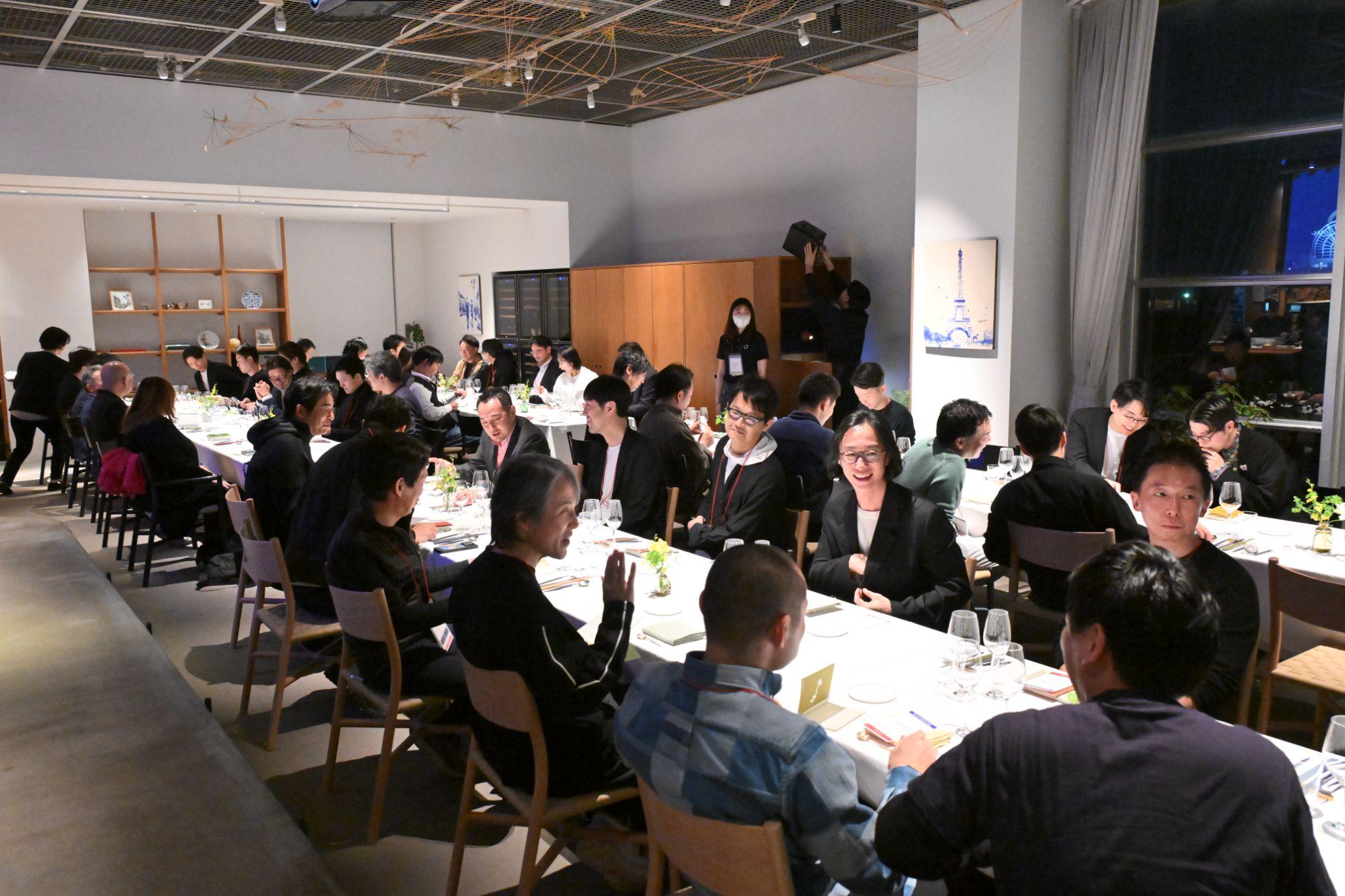 市街地からもほど近いベイサイドプレイス博多にあるフレンチのRestaurant Solaは、ICCサミットの美食体験として毎年利用しており、才能豊かなシェフ吉武 広樹さんが腕をふるうICCサミットの雰囲気にぴったりの素晴らしいレストランだ。このお店の定員いっぱい、ICC代表の小林 雅を含む48名がこのディナーに集まった。