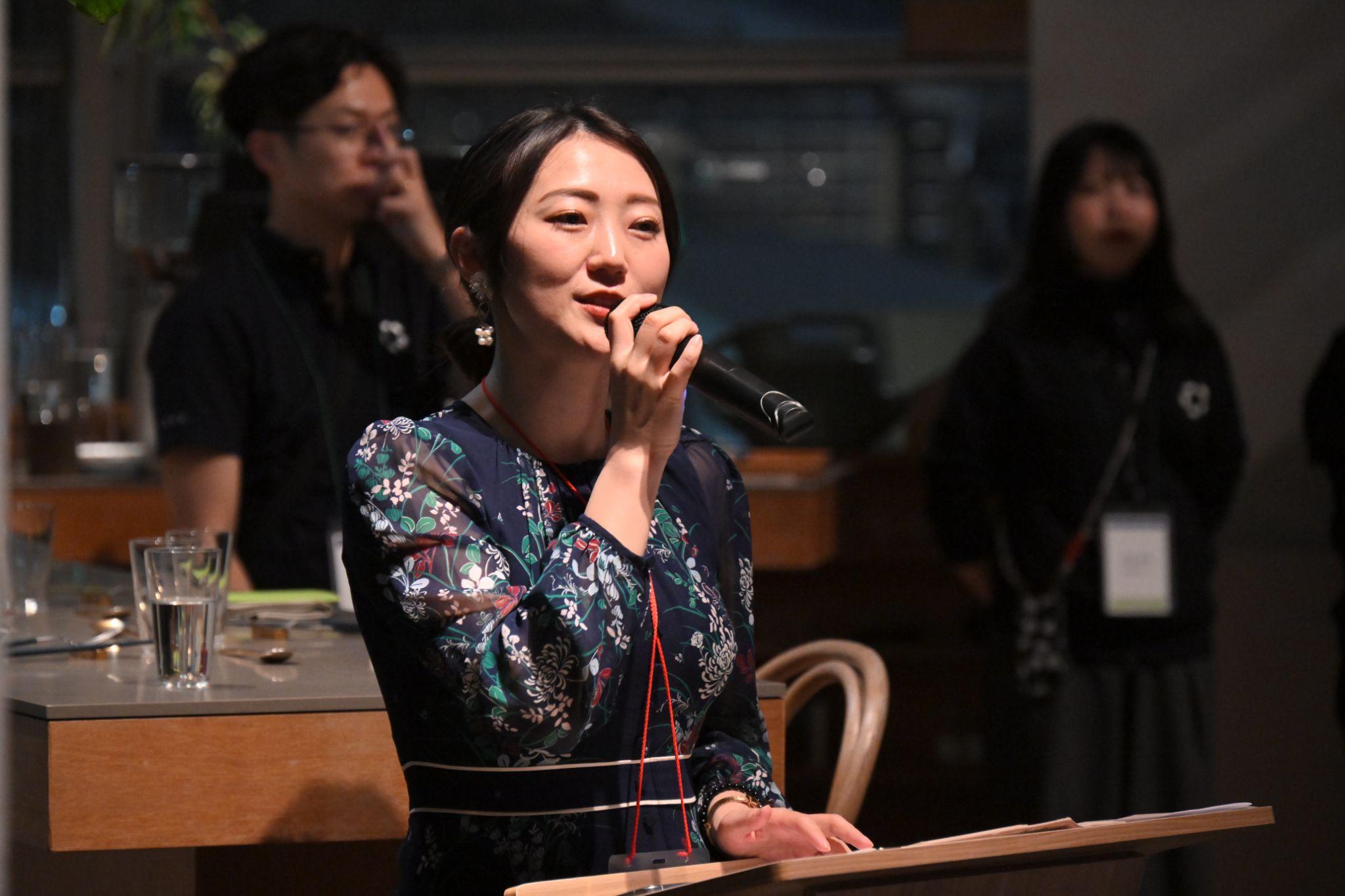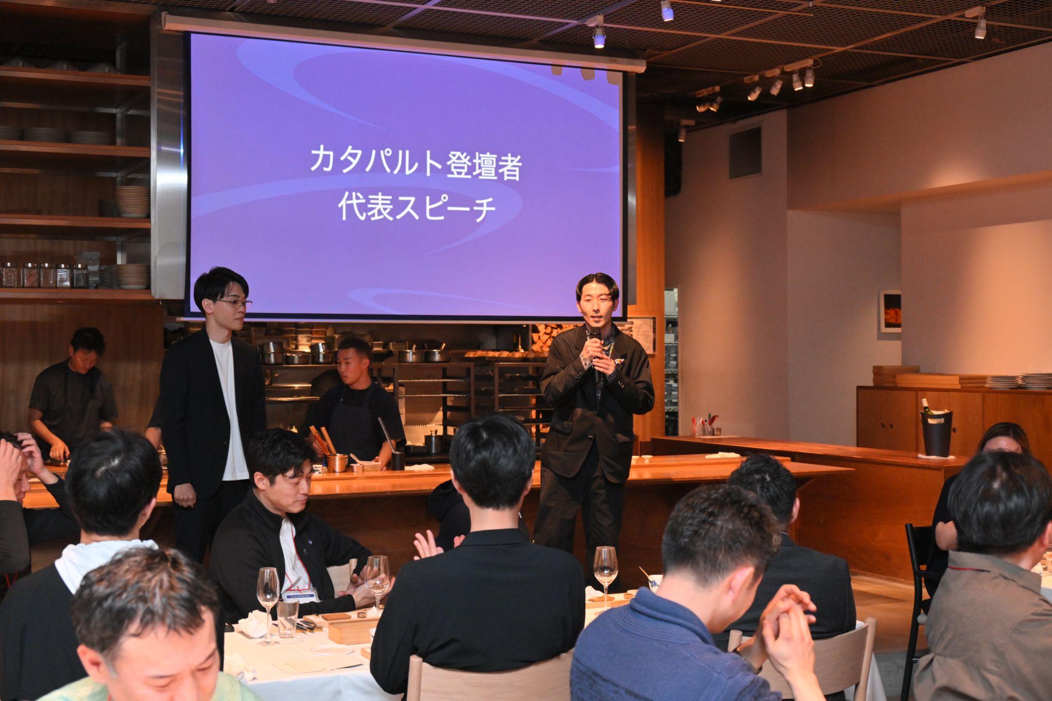 食事の合間には、ICCの歴史をともに作ってきた方々からスピーチをいただいた。小林さんを前職時代から知るプロノバの岡島 悦子さんや、カタパルトの優勝者、リージョナルフィッシュの梅川 忠典さんと、ヘラルボニーの松田 文登さんがスピーチした。