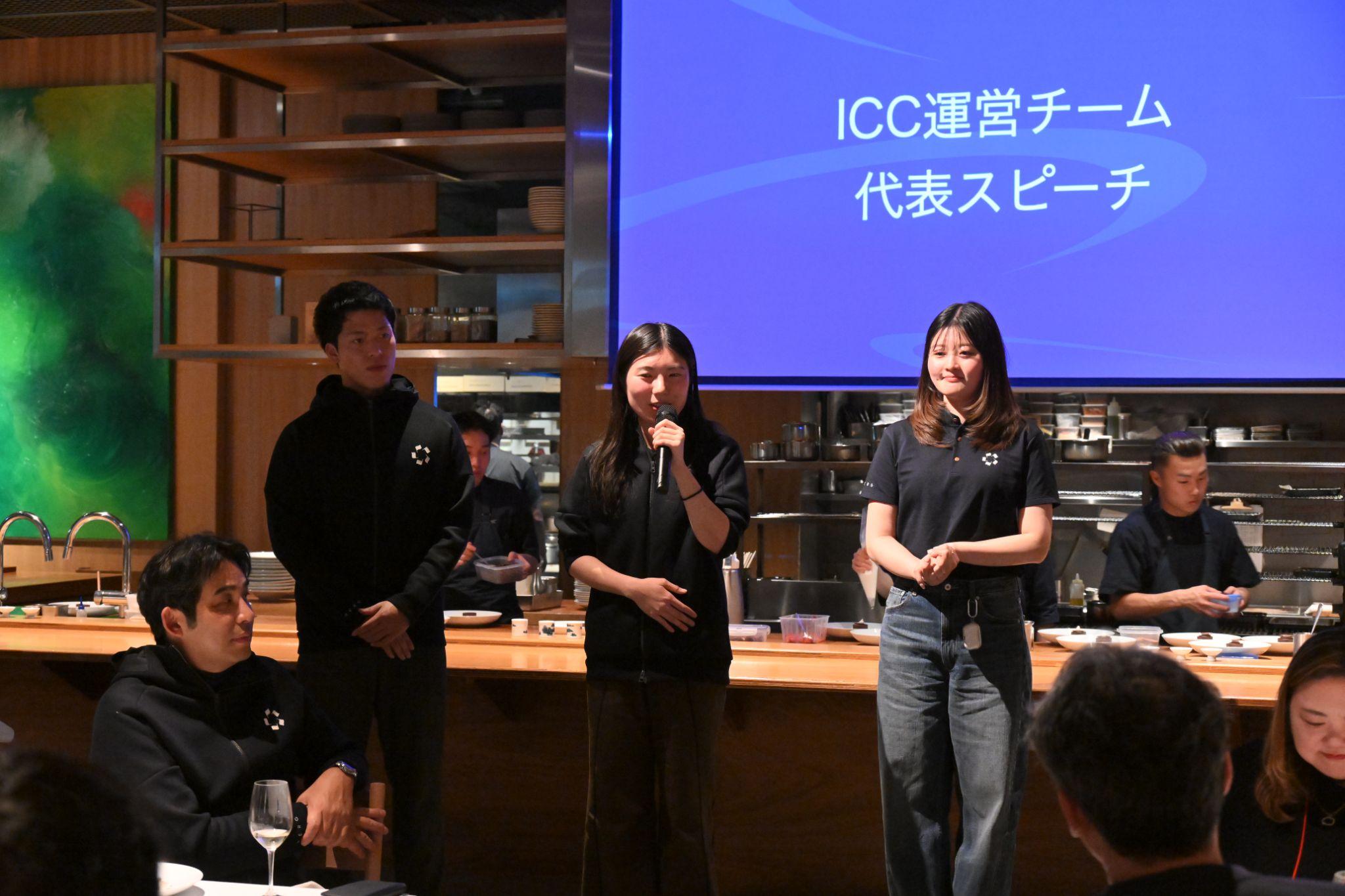 さまざまな人たちが自分にとってのICCやICCへの共感を語ってきたが、それは運営を担うスタッフも同じである。デザートが運ばれてきたころ、運営スタッフの中心的存在ともいえる3人が前方に進み出た。