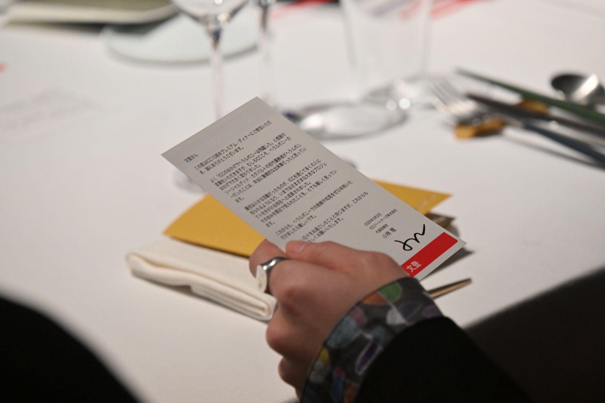 小林さん「ICC10周年プレミアム・ディナーにご参加いただき、誠にありがとうございます。皆さんに書いたメッセージを、僕自身にも宛てて書いてみました。