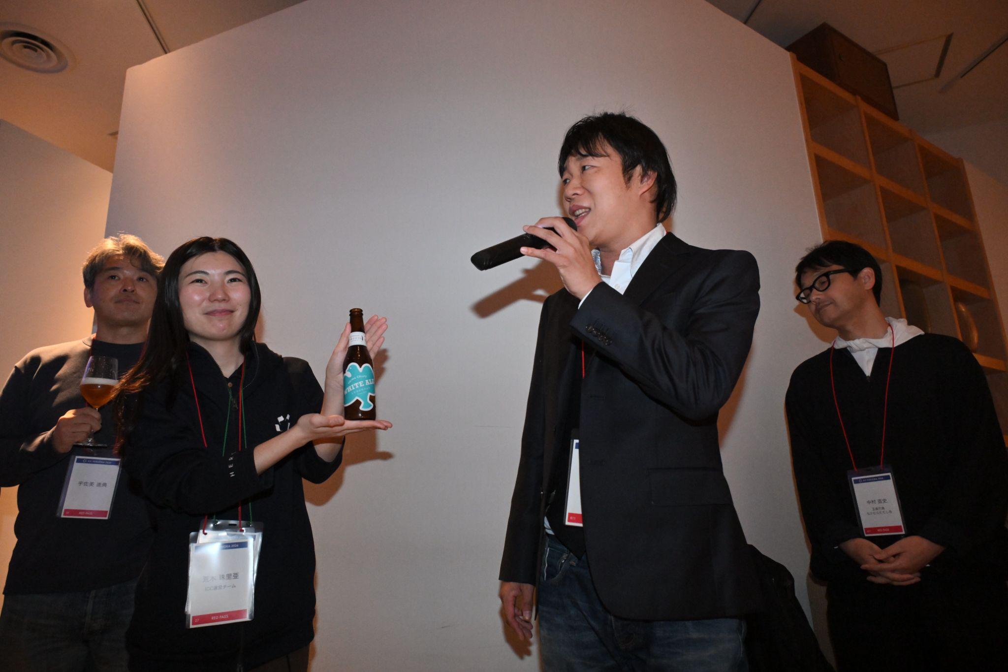 学生時代のインターン先が同じで、現在は違うところで働いているが、ICCでは同じチームで働く3人。荒木さんが代表してスピーチをした。